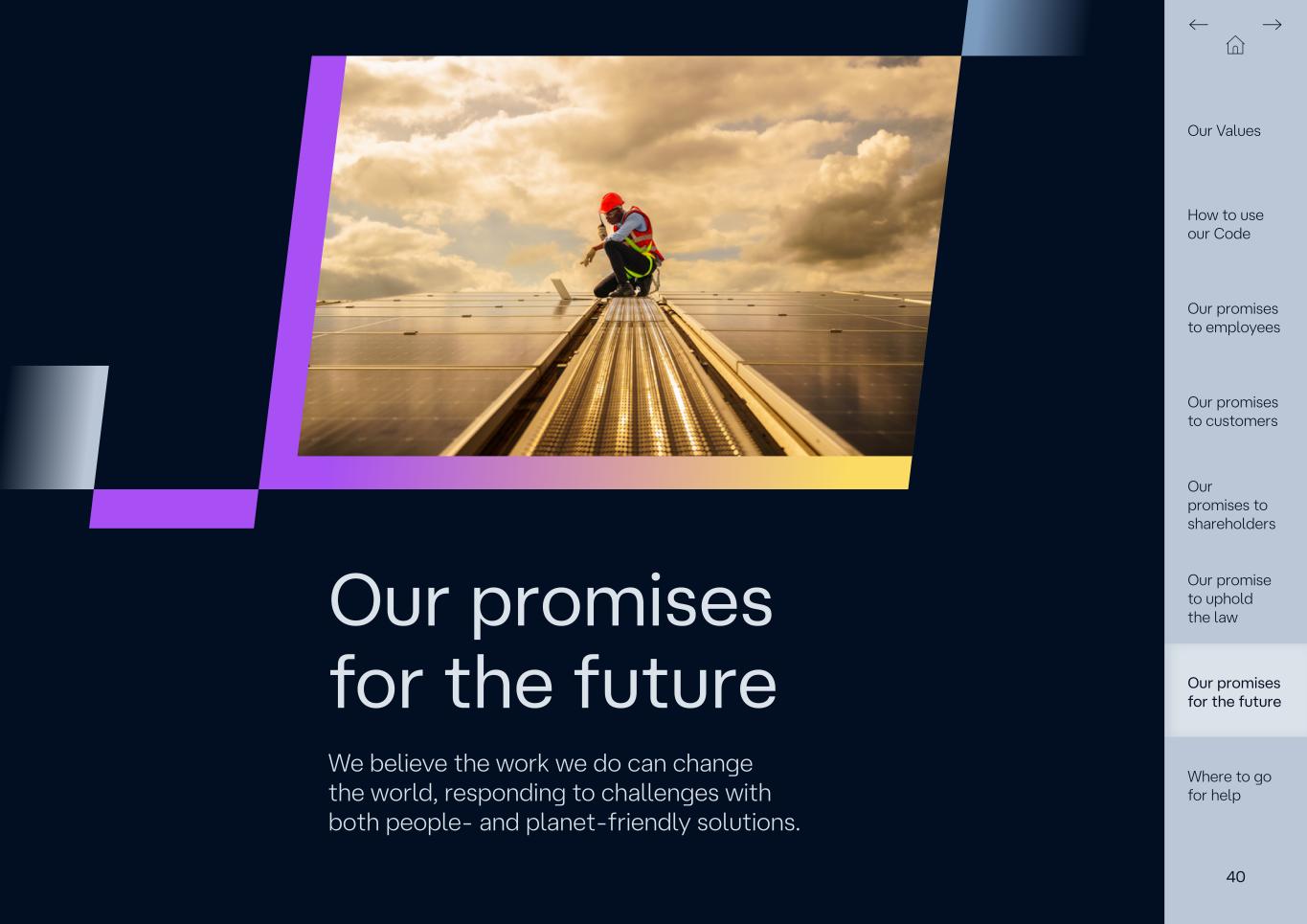 Our promises for the future We believe the work we do can change the world, responding to challenges with both people- and planet-friendly solutions. Our Values How to use our Code Our promises to employees Our promises to customers Our promises to shareholders Our promise to uphold the law Where to go for help 40 Our promises for the future