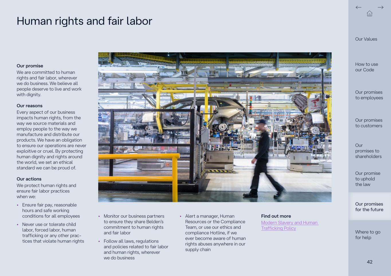 Human rights and fair labor Our promise We are committed to human rights and fair labor, wherever we do business. We believe all people deserve to live and work with dignity. Our reasons Every aspect of our business impacts human rights, from the way we source materials and employ people to the way we manufacture and distribute our products. We have an obligation to ensure our operations are never exploitive or cruel. By protecting human dignity and rights around the world, we set an ethical standard we can be proud of. Our actions We protect human rights and ensure fair labor practices when we: • Ensure fair pay, reasonable hours and safe working conditions for all employees • Never use or tolerate child labor, forced labor, human trafficking or any other prac- tices that violate human rights • Monitor our business partners to ensure they share Belden’s commitment to human rights and fair labor • Follow all laws, regulations and policies related to fair labor and human rights, wherever we do business • Alert a manager, Human Resources or the Compliance Team, or use our ethics and compliance Hotline, if we ever become aware of human rights abuses anywhere in our supply chain Find out more Modern Slavery and Human Trafficking Policy Our Values How to use our Code Our promises to employees Our promises to customers Our promises to shareholders Our promise to uphold the law Where to go for help 42 Our promises for the future
