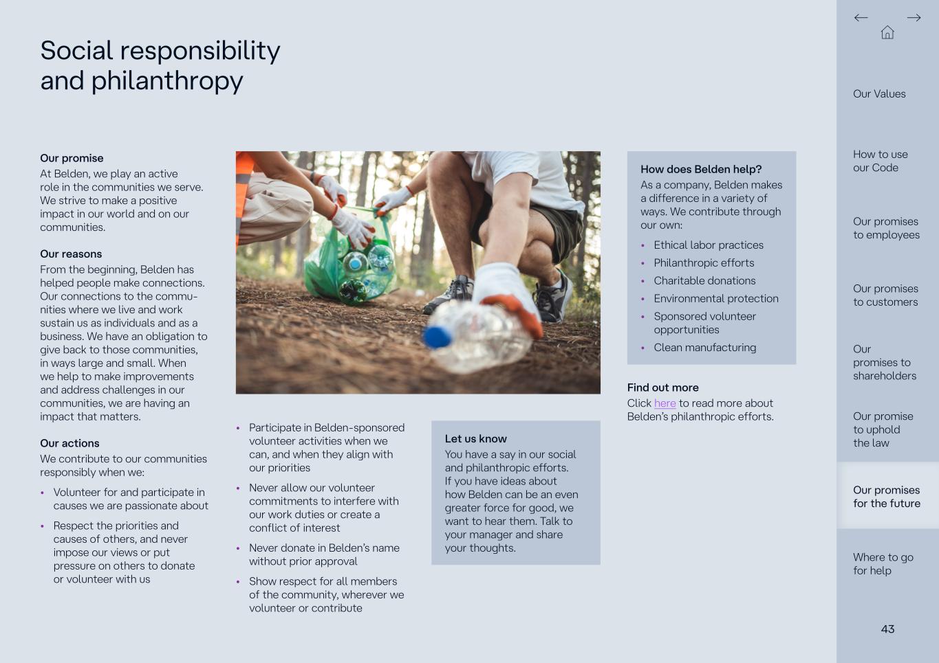 Social responsibility and philanthropy Our promise At Belden, we play an active role in the communities we serve. We strive to make a positive impact in our world and on our communities. Our reasons From the beginning, Belden has helped people make connections. Our connections to the commu- nities where we live and work sustain us as individuals and as a business. We have an obligation to give back to those communities, in ways large and small. When we help to make improvements and address challenges in our communities, we are having an impact that matters. Our actions We contribute to our communities responsibly when we: • Volunteer for and participate in causes we are passionate about • Respect the priorities and causes of others, and never impose our views or put pressure on others to donate or volunteer with us • Participate in Belden-sponsored volunteer activities when we can, and when they align with our priorities • Never allow our volunteer commitments to interfere with our work duties or create a conflict of interest • Never donate in Belden’s name without prior approval • Show respect for all members of the community, wherever we volunteer or contribute Let us know You have a say in our social and philanthropic efforts. If you have ideas about how Belden can be an even greater force for good, we want to hear them. Talk to your manager and share your thoughts. How does Belden help? As a company, Belden makes a difference in a variety of ways. We contribute through our own: • Ethical labor practices • Philanthropic efforts • Charitable donations • Environmental protection • Sponsored volunteer opportunities • Clean manufacturing Find out more Click here to read more about Belden’s philanthropic efforts. Our Values How to use our Code Our promises to employees Our promises to customers Our promises to shareholders Our promise to uphold the law Where to go for help 43 Our promises for the future