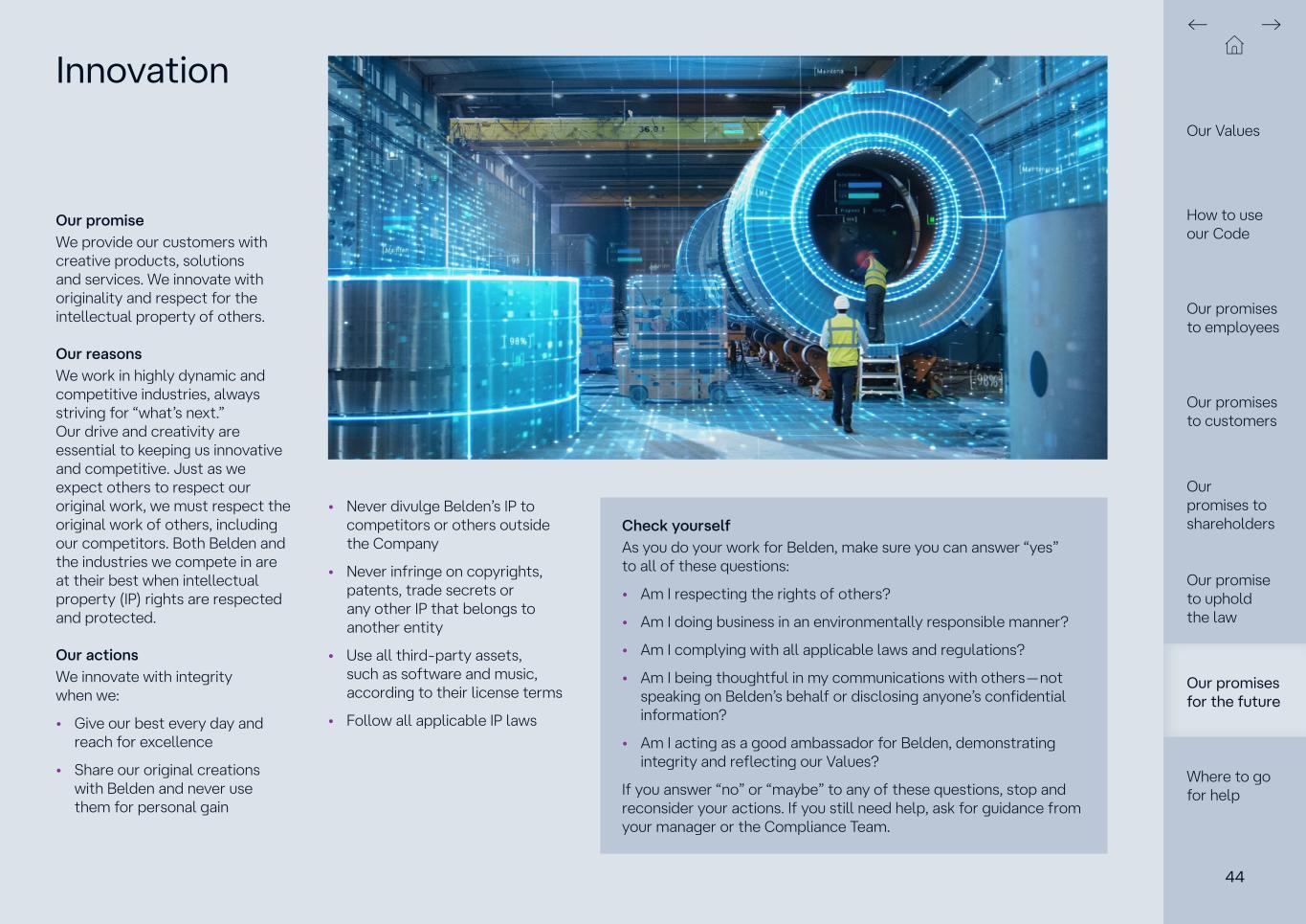 Innovation Our promise We provide our customers with creative products, solutions and services. We innovate with originality and respect for the intellectual property of others. Our reasons We work in highly dynamic and competitive industries, always striving for “what’s next.” Our drive and creativity are essential to keeping us innovative and competitive. Just as we expect others to respect our original work, we must respect the original work of others, including our competitors. Both Belden and the industries we compete in are at their best when intellectual property (IP) rights are respected and protected. Our actions We innovate with integrity when we: • Give our best every day and reach for excellence • Share our original creations with Belden and never use them for personal gain • Never divulge Belden’s IP to competitors or others outside the Company • Never infringe on copyrights, patents, trade secrets or any other IP that belongs to another entity • Use all third-party assets, such as software and music, according to their license terms • Follow all applicable IP laws Check yourself As you do your work for Belden, make sure you can answer “yes” to all of these questions: • Am I respecting the rights of others? • Am I doing business in an environmentally responsible manner? • Am I complying with all applicable laws and regulations? • Am I being thoughtful in my communications with others — not speaking on Belden’s behalf or disclosing anyone’s confidential information? • Am I acting as a good ambassador for Belden, demonstrating integrity and reflecting our Values? If you answer “no” or “maybe” to any of these questions, stop and reconsider your actions. If you still need help, ask for guidance from your manager or the Compliance Team. Our Values How to use our Code Our promises to employees Our promises to customers Our promises to shareholders Our promise to uphold the law Where to go for help 44 Our promises for the future