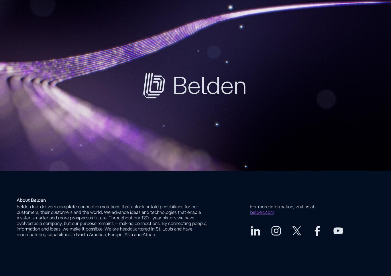 About Belden Belden Inc. delivers complete connection solutions that unlock untold possibilities for our customers, their customers and the world. We advance ideas and technologies that enable a safer, smarter and more prosperous future. Throughout our 120+ year history we have evolved as a company, but our purpose remains — making connections. By connecting people, information and ideas, we make it possible. We are headquartered in St. Louis and have manufacturing capabilities in North America, Europe, Asia and Africa. For more information, visit us at belden.com