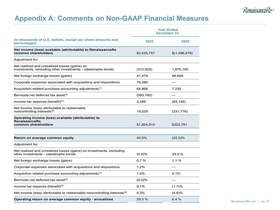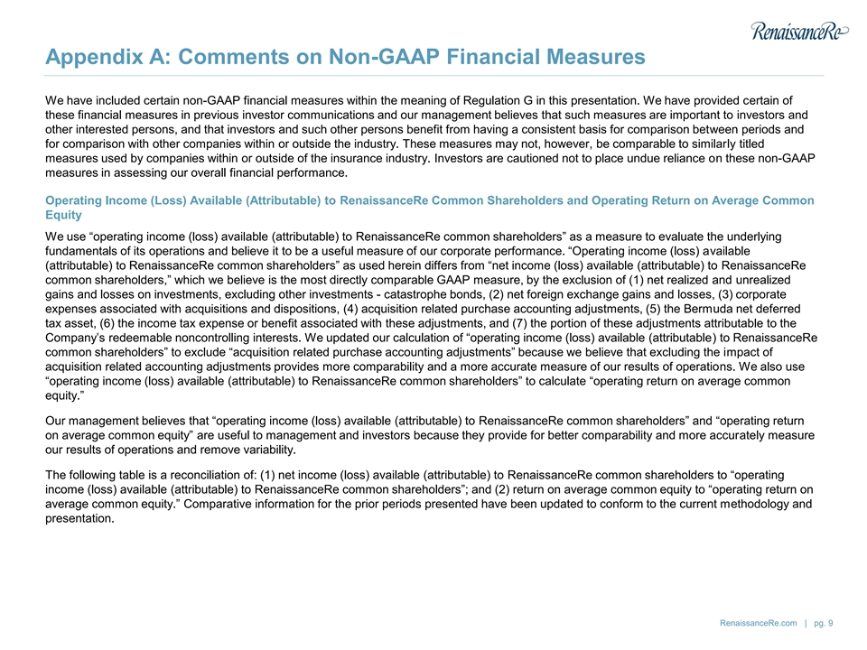 Appendix A: Comments on Non-GAAP Financial Measures We have included certain non-GAAP financial measures within the meaning of Regulation G in this presentation. We have provided certain of these financial measures in previous investor communications and our management believes that such measures are important to investors and other interested persons, and that investors and such other persons benefit from having a consistent basis for comparison between periods and for comparison with other companies within or outside the industry. These measures may not, however, be comparable to similarly titled measures used by companies within or outside of the insurance industry. Investors are cautioned not to place undue reliance on these non-GAAP measures in assessing our overall financial performance. Operating Income (Loss) Available (Attributable) to RenaissanceRe Common Shareholders and Operating Return on Average Common Equity We use “operating income (loss) available (attributable) to RenaissanceRe common shareholders” as a measure to evaluate the underlying fundamentals of its operations and believe it to be a useful measure of our corporate performance. “Operating income (loss) available (attributable) to RenaissanceRe common shareholders” as used herein differs from “net income (loss) available (attributable) to RenaissanceRe common shareholders,” which we believe is the most directly comparable GAAP measure, by the exclusion of (1) net realized and unrealized gains and losses on investments, excluding other investments - catastrophe bonds, (2) net foreign exchange gains and losses, (3) corporate expenses associated with acquisitions and dispositions, (4) acquisition related purchase accounting adjustments, (5) the Bermuda net deferred tax asset, (6) the income tax expense or benefit associated with these adjustments, and (7) the portion of these adjustments attributable to the Company’s redeemable noncontrolling interests. We updated our calculation of “operating income (loss) available (attributable) to RenaissanceRe common shareholders” to exclude “acquisition related purchase accounting adjustments” because we believe that excluding the impact of acquisition related accounting adjustments provides more comparability and a more accurate measure of our results of operations. We also use “operating income (loss) available (attributable) to RenaissanceRe common shareholders” to calculate “operating return on average common equity.” Our management believes that “operating income (loss) available (attributable) to RenaissanceRe common shareholders” and “operating return on average common equity” are useful to management and investors because they provide for better comparability and more accurately measure our results of operations and remove variability. The following table is a reconciliation of: (1) net income (loss) available (attributable) to RenaissanceRe common shareholders to “operating income (loss) available (attributable) to RenaissanceRe common shareholders”; and (2) return on average common equity to “operating return on average common equity.” Comparative information for the prior periods presented have been updated to conform to the current methodology and presentation. RenaissanceRe.com | pg. 9