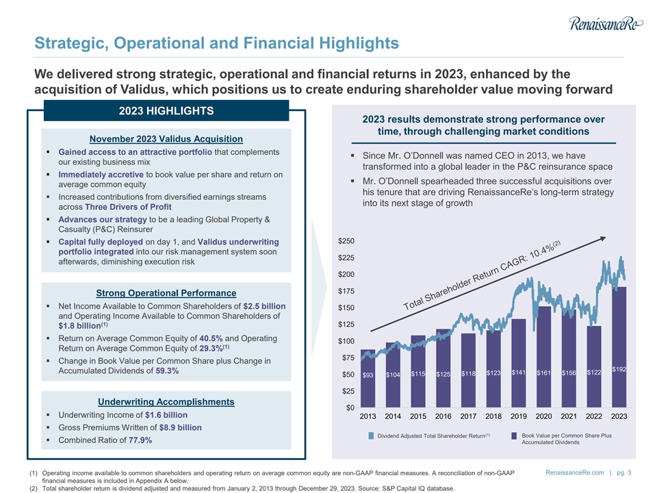 Strategic, Operational and Financial Highlights We delivered strong strategic, operational and financial returns in 2023, enhanced by the acquisition of Validus, which positions us to create enduring shareholder value moving forward 2023 HIGHLIGHTS 2023 results demonstrate strong performance over time, through challenging market conditions November 2023 Validus Acquisition ▪ Gained access to an attractive portfolio that complements ▪ Since Mr. O’Donnell was named CEO in 2013, we have our existing business mix transformed into a global leader in the P&C reinsurance space ▪ Immediately accretive to book value per share and return on ▪ Mr. O’Donnell spearheaded three successful acquisitions over average common equity his tenure that are driving RenaissanceRe’s long-term strategy ▪ Increased contributions from diversified earnings streams into its next stage of growth across Three Drivers of Profit ▪ Advances our strategy to be a leading Global Property & Casualty (P&C) Reinsurer $250 ▪ Capital fully deployed on day 1, and Validus underwriting portfolio integrated into our risk management system soon $225 afterwards, diminishing execution risk $200 $175 Strong Operational Performance ▪ Net Income Available to Common Shareholders of $2.5 billion $150 and Operating Income Available to Common Shareholders of (1) $125 $1.8 billion ▪ Return on Average Common Equity of 40.5% and Operating $100 (1) Return on Average Common Equity of 29.3% $75 ▪ Change in Book Value per Common Share plus Change in $192 Accumulated Dividends of 59.3% $123 $141 $161 $156 $122 $115 $118 $50 $104 $125 $93 $25 Underwriting Accomplishments $0 ▪ Underwriting Income of $1.6 billion 2013 2014 2015 2016 2017 2018 2019 2020 2021 2022 2023 ▪ Gross Premiums Written of $8.9 billion (1) Book Value per Common Share Plus Dividend Adjusted Total Shareholder Return ▪ Combined Ratio of 77.9% Accumulated Dividends RenaissanceRe.com | pg. 3 (1) Operating income available to common shareholders and operating return on average common equity are non-GAAP financial measures. A reconciliation of non-GAAP financial measures is included in Appendix A below. (2) Total shareholder return is dividend adjusted and measured from January 2, 2013 through December 29, 2023. Source: S&P Capital IQ database.