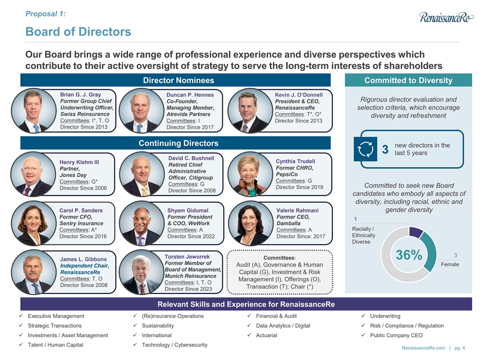 Proposal 1: Board of Directors Our Board brings a wide range of professional experience and diverse perspectives which contribute to their active oversight of strategy to serve the long-term interests of shareholders Director Nominees Committed to Diversity Brian G. J. Gray Duncan P. Hennes Kevin J. O’Donnell Rigorous director evaluation and Former Group Chief Co-Founder, President & CEO, Underwriting Officer, Managing Member, RenaissanceRe selection criteria, which encourage Swiss Reinsurance Atrevida Partners Committees: T*, O* diversity and refreshment Committees: I*, T, O Committees: I Director Since 2013 Director Since 2013 Director Since 2017 Continuing Directors new directors in the 3 last 5 years David C. Bushnell Cynthia Trudell Henry Klehm III Retired Chief Former CHRO, Partner, Administrative PepsiCo Jones Day Officer, Citigroup Committees: G Committees: G* Committees: G Committed to seek new Board Director Since 2019 Director Since 2006 Director Since 2008 candidates who embody all aspects of diversity, including racial, ethnic and Carol P. Sanders Shyam Gidumal Valerie Rahmani gender diversity Former CFO, Former President Former CEO, 1 Sentry Insurance & COO, WeWork Damballa Racially / Committees: A* Committees: A Committees: A Ethnically Director Since 2016 Director Since 2022 Director Since: 2017 Diverse 3 Torsten Jeworrek 36% Committees: James L. Gibbons Former Member of Female Audit (A), Governance & Human Independent Chair, Board of Management, RenaissanceRe Capital (G), Investment & Risk Munich Reinsurance Committees: T, O Management (I), Offerings (O), Committees: I, T, O Director Since 2008 Transaction (T); Chair (*) Director Since 2023 Relevant Skills and Experience for RenaissanceRe ✓ Executive Management ✓ (Re)insurance Operations ✓ Financial & Audit ✓ Underwriting ✓ Strategic Transactions ✓ Sustainability✓ Data Analytics / Digital ✓ Risk / Compliance / Regulation ✓ Investments / Asset Management ✓ International✓ Actuarial✓ Public Company CEO ✓ Talent / Human Capital ✓ Technology / Cybersecurity RenaissanceRe.com | pg. 4