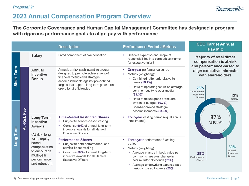 Proposal 2: 2023 Annual Compensation Program Overview The Corporate Governance and Human Capital Management Committee has designed a program with rigorous performance goals to align pay with performance CEO Target Annual Description Performance Period / Metrics Pay Mix Fixed component of compensation ▪ Reflects expertise and scope of Salary Majority of total direct responsibilities in a competitive market compensation is at-risk for executive talent and performance-based to Annual, at-risk cash incentive program ▪ One-year performance period Annual align executive interests designed to promote achievement of ▪ Metrics (weighting): Incentive with shareholders financial metrics and strategic • Combined ratio rank relative to Bonus accomplishments against pre-defined peers (16.7%) targets that support long-term growth and • Ratio of operating return on average 28% operational efficiencies common equity to peer median Time-Vested (33.3%) Restricted 13% Shares • Ratio of actual gross premiums Salary written to budget (16.7%) • Board-approved strategic accomplishments (33.3%) Time-Vested Restricted Shares ▪ Four-year vesting period (equal annual Long-Term 87% installments) ▪ Subject to service-based vesting (1) Incentive At-Risk ▪ Comprise 50% of annual long-term Awards incentive awards for all Named Executive Officers (At-risk, long- term, equity- ▪ Three-year performance / vesting Performance Shares based period ▪ Subject to both performance- and compensation 30% service-based vesting ▪ Metrics (weighting): Annual to encourage ▪ Comprise 50% of annual long-term • Average change in book value per Incentive 28% multi-year incentive awards for all Named Bonus common share plus change in Performance performance Executive Officers accumulated dividends (75%) Shares and retention) • Average underwriting expense ratio rank compared to peers (25%) RenaissanceRe.com | pg. 5 (1) Due to rounding, percentages may not total precisely. Long-Term Short-Term At -Risk Pay