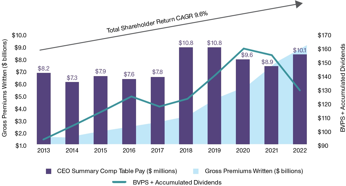Over the past decade, management, with the Board’s support, has focused on building sustainable platforms to support long-term profitable growth. We have scaled and diversified our reinsurance business by adding new products, platforms, capabilities and capital. These actions have diversified our earnings, increased our leverage, and secured us a leading competitive position. We took several steps in 2022 to further this journey that we believe will create significant shareholder value. These included launching Fontana, the first rated third-party balance sheet dedicated to casualty and specialty risk; successfully managing our capital to take advantage of opportunities in a highly volatile market; and demonstrating leadership and discipline at the January 1 renewal, resulting in an increased margin of safety for our shareholders.
