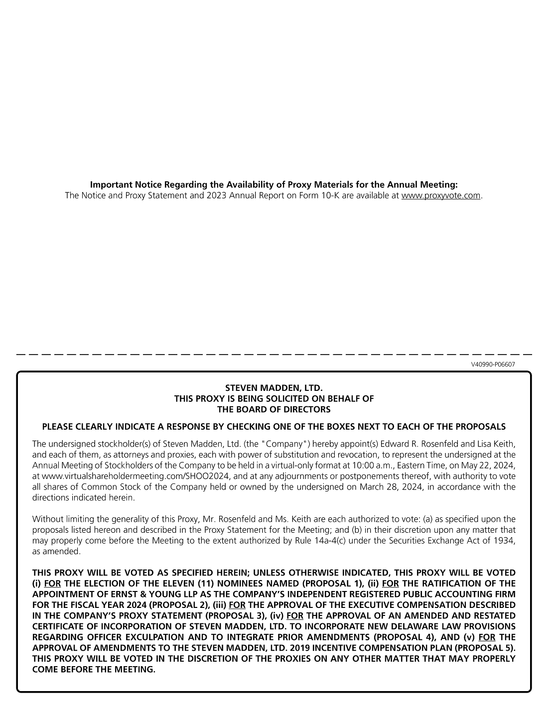 The Board of Directors of Steven Madden, Ltd. requests your proxy in connection with the Annual Meeting of Stockholders (the “Annual Meeting”) of Steven Madden, Ltd. (the “Company,” “we,” or “our”). The Annual Meeting will be held on Wednesday, May 22, 2024, at 10:00 a.m. Eastern time in a virtual-only format. Proxies also may be voted at any adjournments or postponements of the Annual Meeting. You will not be able to attend the Annual Meeting physically in person.