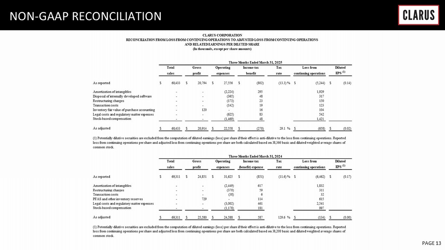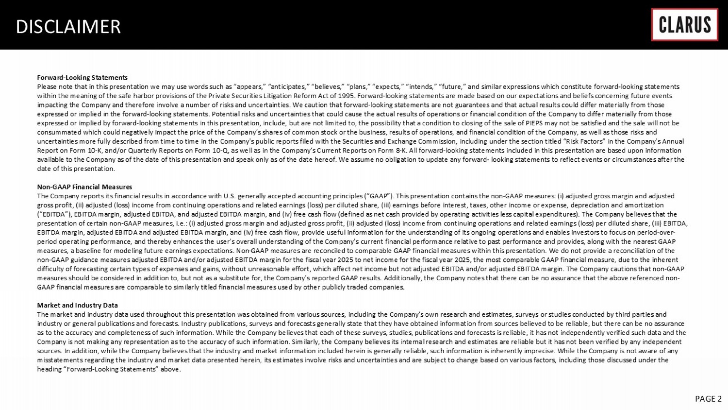6 February 2023 PAGE 2 Forward - Looking Statements Please note that in this presentation we may use words such as “appears,” “anticipates,” “believes,” “plans,” “expects,” “int end s,” “future,” and similar expressions which constitute forward - looking statements within the meaning of the safe harbor provisions of the Private Securities Litigation Reform Act of 1995. Forward - looking statem ents are made based on our expectations and beliefs concerning future events impacting the Company and therefore involve a number of risks and uncertainties. We caution that forward - looking statements are not guarantees and that actual results could differ materially from those expressed or implied in the forward - looking statements. Potential risks and uncertainties that could cause the actual results of operations or financial condition of the Company to differ materially from those expressed or implied by forward - looking statements in this presentation, include, but are not limited to, the possibility that a condition to closing of the sale of PIEPS may not be satisfied and the sale will not be consummated which could negatively impact the price of the Company’s shares of common stock or the business, results of opera tio ns, and financial condition of the Company, as well as those risks and uncertainties more fully described from time to time in the Company's public reports filed with the Securities and Exchange C omm ission, including under the section titled “Risk Factors” in the Company's Annual Report on Form 10 - K, and/or Quarterly Reports on Form 10 - Q, as well as in the Company’s Current Reports on Form 8 - K. All forward - looking statements included in this presentation are based upon information available to the Company as of the date of this presentation and speak only as of the date hereof. We assume no obligation to up date any forward - looking statements to reflect events or circumstances after the date of this presentation. Non - GAAP Financial Measures The Company reports its financial results in accordance with U.S. generally accepted accounting principles (“GAAP”). This pre sen tation contains the non - GAAP measures: ( i ) adjusted gross margin and adjusted gross profit, (ii) adjusted (loss) income from continuing operations and related earnings (loss) per diluted share, (iii) ear nin gs before interest, taxes, other income or expense, depreciation and amortization (“EBITDA”), EBITDA margin, adjusted EBITDA, and adjusted EBITDA margin, and (iv) free cash flow (defined as net cash provided by operating activities less capital expenditures). The Company believes that the presentation of certain non - GAAP measures, i.e.: ( i ) adjusted gross margin and adjusted gross profit, (ii) adjusted (loss) income from continuing operations and related earning s ( loss) per diluted share, (iii) EBITDA, EBITDA margin, adjusted EBITDA and adjusted EBITDA margin, and (iv) free cash flow, provide useful information for the unders tan ding of its ongoing operations and enables investors to focus on period - over - period operating performance, and thereby enhances the user's overall understanding of the Company's current financial perfor man ce relative to past performance and provides, along with the nearest GAAP measures, a baseline for modeling future earnings expectations. Non - GAAP measures are reconciled to comparable GAAP financial me asures within this presentation. We do not provide a reconciliation of the non - GAAP guidance measures adjusted EBITDA and/or adjusted EBITDA margin for the fiscal year 2025 to net income for the fiscal y ear 2025, the most comparable GAAP financial measure, due to the inherent difficulty of forecasting certain types of expenses and gains, without unreasonable effort, which affect net income but not a dju sted EBITDA and/or adjusted EBITDA margin. The Company cautions that non - GAAP measures should be considered in addition to, but not as a substitute for, the Company's reported GAAP results. Additionally, th e Company notes that there can be no assurance that the above referenced non - GAAP financial measures are comparable to similarly titled financial measures used by other publicly traded companies. Market and Industry Data The market and industry data used throughout this presentation was obtained from various sources, including the Company’s own re search and estimates, surveys or studies conducted by third parties and industry or general publications and forecasts. Industry publications, surveys and forecasts generally state that they have o bta ined information from sources believed to be reliable, but there can be no assurance as to the accuracy and completeness of such information. While the Company believes that each of these surveys, studies, publ ica tions and forecasts is reliable, it has not independently verified such data and the Company is not making any representation as to the accuracy of such information. Similarly, the Company believes its internal re search and estimates are reliable but it has not been verified by any independent sources. In addition, while the Company believes that the industry and market information included herein is generally reliab le, such information is inherently imprecise. While the Company is not aware of any misstatements regarding the industry and market data presented herein, its estimates involve risks and uncertainties and are sub ject to change based on various factors, including those discussed under the heading “Forward - Looking Statements” above. DISCLAIMER