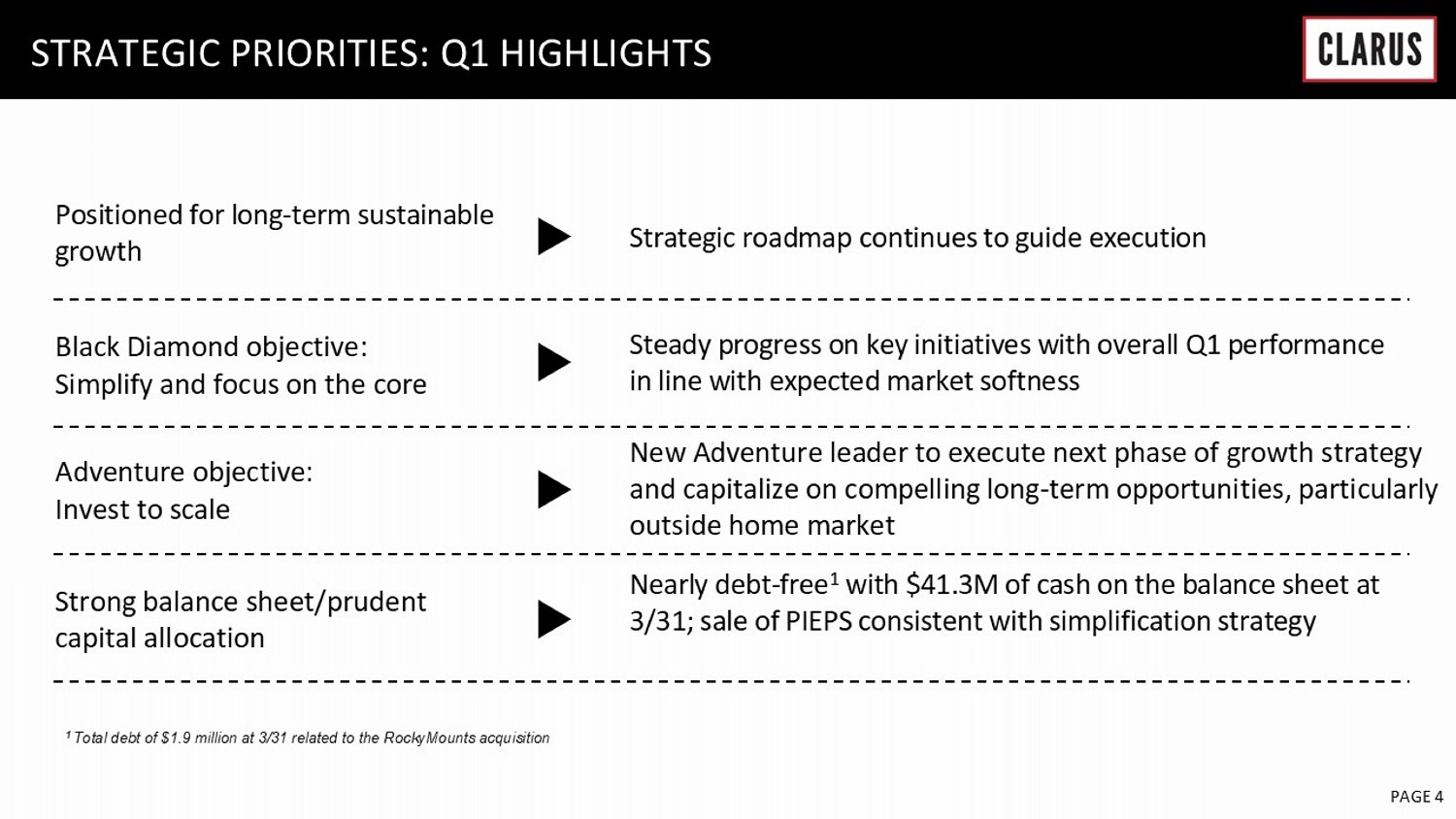 Warren Kanders EXECUTIVE CHAIRMAN Clarus TODAY’S PRESENTERS Mike Yates CFO Clarus Neil Fiske PRESIDENT Black Diamond Equipment