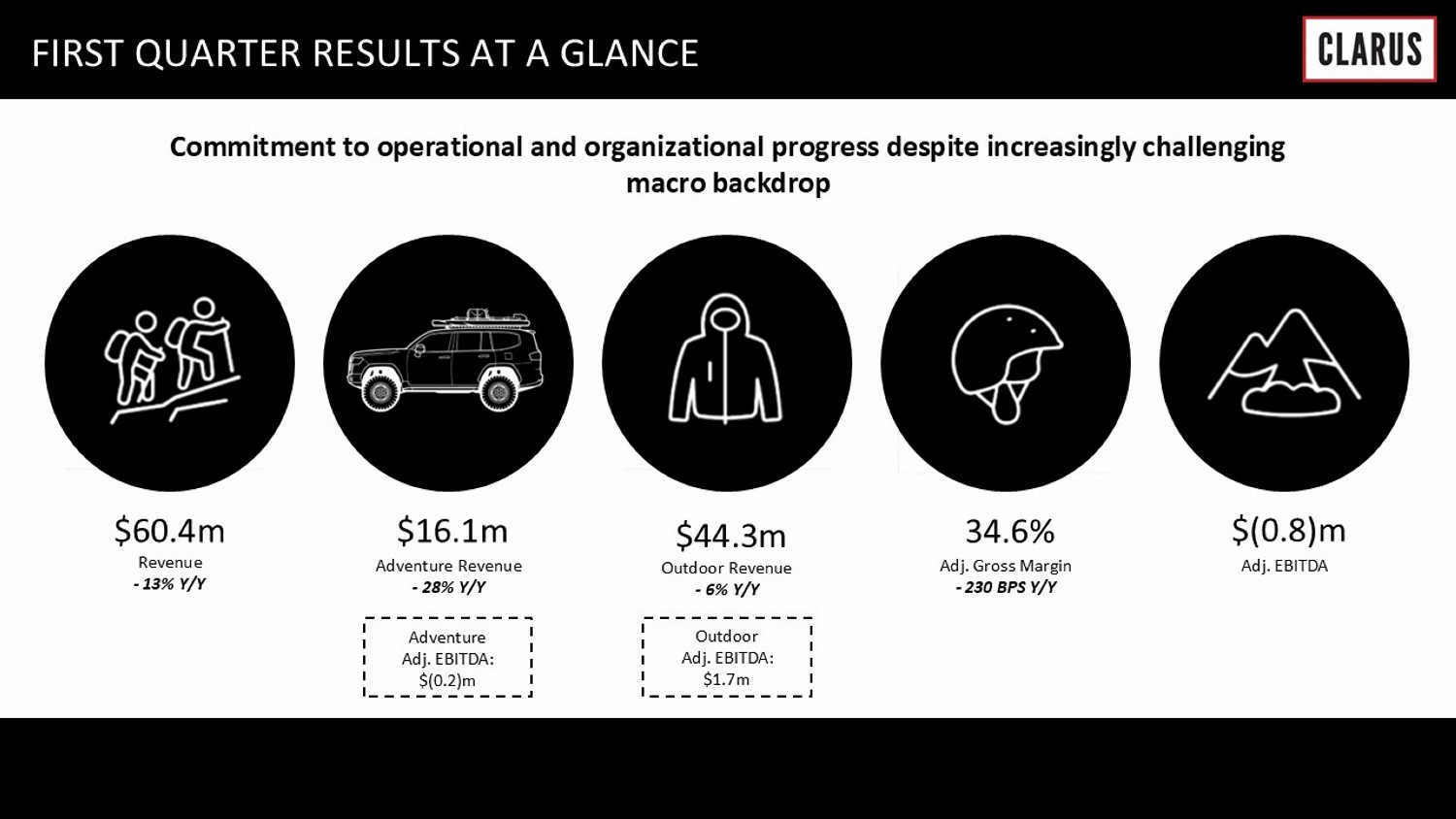 Commitment to operational and organizational progress despite increasingly challenging macro backdrop $ 60.4m $ 16.1m $44.3 m 34.6 % $(0.8 )m Revenue - 13% Y/Y Adventure Revenue - 28% Y/Y Outdoor Revenue - 6% Y/Y Adj. Gross Margin - 230 BPS Y/Y Adj. EBITDA FIRST QUARTER RESULTS AT A GLANCE Adventure Adj. EBITDA: $(0.2)m Outdoor Adj. EBITDA: $1.7m