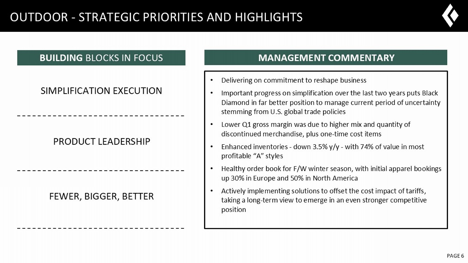 6 February 2023 PAGE 6 OUTDOOR - STRATEGIC PRIORITIES AND HIGHLIGHTS • Delivering on commitment to reshape business • Important progress on simplification over the last two years puts Black Diamond in far better position to manage current period of uncertainty stemming from U.S. global trade policies • Lower Q1 gross margin was due to higher mix and quantity of discontinued merchandise, plus one - time cost items • Enhanced inventories - down 3.5% y/y - with 74% of value in most profitable “A” styles • Healthy order book for F/W winter season, with initial apparel bookings up 30% in Europe and 50% in North America • Actively implementing solutions to offset the cost impact of tariffs, taking a long - term view to emerge in an even stronger competitive position MANAGEMENT COMMENTARY BUILDING BLOCKS IN FOCUS SIMPLIFICATION EXECUTION PRODUCT LEADERSHIP FEWER, BIGGER, BETTER