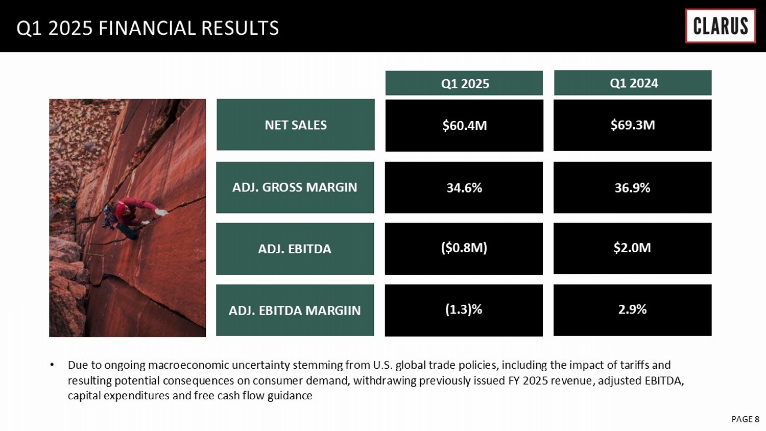 6 February 2023 PAGE 7 ADVENTURE - STRATEGIC PRIORITIES AND HIGHLIGHTS • Promoted leadership from within and appointed Tripp Wyckoff to serve as new Adventure head • Industry veteran with 20+ yrs experience, Wyckoff has helped drive critical progress in U.S. organization since joining Clarus in July 2024 • Lower Q1 results – 28% y/y revenue decline related to performance at three accounts • Sales in Australia, removing impact from three accounts, were flat y/y despite difficult market • RockyMounts delivered Q1 revenue of $1.3M • Continuing to make inroads with new customers across all product categories, particularly in North America and R.O.W. MANAGEMENT COMMENTARY BUILDING BLOCKS IN FOCUS INVESTMENT INTO U.S. AND ROW INVESTMENT INTO BRAND REBUILT LEADERSHIP TEAM