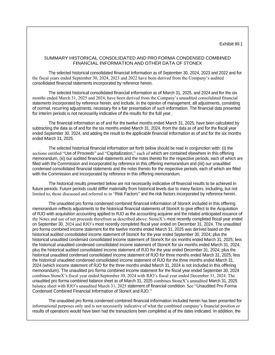 SUMMARY HISTORICAL CONSOLIDATED AND PRO FORMA CONDENSED COMBINED FINANCIAL INFORMATION AND OTHER DATA OF STONEX The selected historical consolidated financial information as of September 30, 2024, 2023 and 2022 and for the fiscal years ended September 30, 2024, 2023 and 2022 have been derived from the Company’s audited consolidated financial statements incorporated by reference herein. The selected historical consolidated financial information as of March 31, 2025, and 2024 and for the six months ended March 31, 2025 and 2024, have been derived from the Company’s unaudited consolidated financial statements incorporated by reference herein, and include, in the opinion of management, all adjustments, consisting of normal, recurring adjustments, necessary for a fair presentation of such information. The financial data presented for interim periods is not necessarily indicative of the results for the full year. The financial information as of and for the twelve months ended March 31, 2025, have been calculated by subtracting the data as of and for the six months ended March 31, 2024, from the data as of and for the fiscal year ended September 30, 2024, and adding the result to the applicable financial information as of and for the six months ended March 31, 2025. The selected historical financial information set forth below should be read in conjunction with: (i) the sections entitled “Use of Proceeds” and “Capitalization,” each of which are contained elsewhere in this offering memorandum, (ii) our audited financial statements and the notes thereto for the respective periods, each of which are filed with the Commission and incorporated by reference in this offering memorandum and (iii) our unaudited condensed consolidated financial statements and the notes thereto for the respective periods, each of which are filed with the Commission and incorporated by reference in this offering memorandum. The historical results presented below are not necessarily indicative of financial results to be achieved in future periods. Future periods could differ materially from historical levels due to many factors, including, but not limited to, those discussed and referred to in “Risk Factors” and the risk factors incorporated by reference herein. The unaudited pro forma condensed combined financial information of StoneX included in this offering memorandum reflects adjustments to the historical financial statements of StoneX to give effect to the Acquisition of RJO with acquisition accounting applied to RJO as the accounting acquiree and the related anticipated issuance of the Notes and use of net proceeds therefrom as described above. StoneX’s most recently completed fiscal year ended on September 30, 2024 and RJO’s most recently completed fiscal year ended on December 31, 2024. The unaudited pro forma combined income statement for the twelve months ended March 31, 2025 was derived based on the historical audited consolidated income statement of StoneX for the year ended September 30, 2024; plus the historical unaudited condensed consolidated income statement of StoneX for six months ended March 31, 2025; less the historical unaudited condensed consolidated income statement of StoneX for six months ended March 31, 2024; plus the historical audited consolidated income statement of RJO for the year ended December 31, 2024; plus the historical unaudited condensed consolidated income statement of RJO for three months ended March 31, 2025; less the historical unaudited condensed consolidated income statement of RJO for the three months ended March 31, 2024 (which income statement of RJO for the three months ended March 31, 2024 is not included in this offering memorandum). The unaudited pro forma combined income statement for the fiscal year ended September 30, 2024 combines StoneX’s fiscal year ended September 30, 2024 with RJO’s fiscal year ended December 31, 2024. The unaudited pro forma combined balance sheet as of March 31, 2025 combines StoneX’s unaudited March 31, 2025 balance sheet with RJO’s unaudited March 31, 2025 statement of financial condition. See “Unaudited Pro Forma Condensed Combined Financial Information of StoneX and RJO.” The unaudited pro forma condensed combined financial information included herein has been presented for informational purposes only and is not necessarily indicative of what the combined company’s financial position or results of operations would have been had the transactions been completed as of the dates indicated. In addition, the