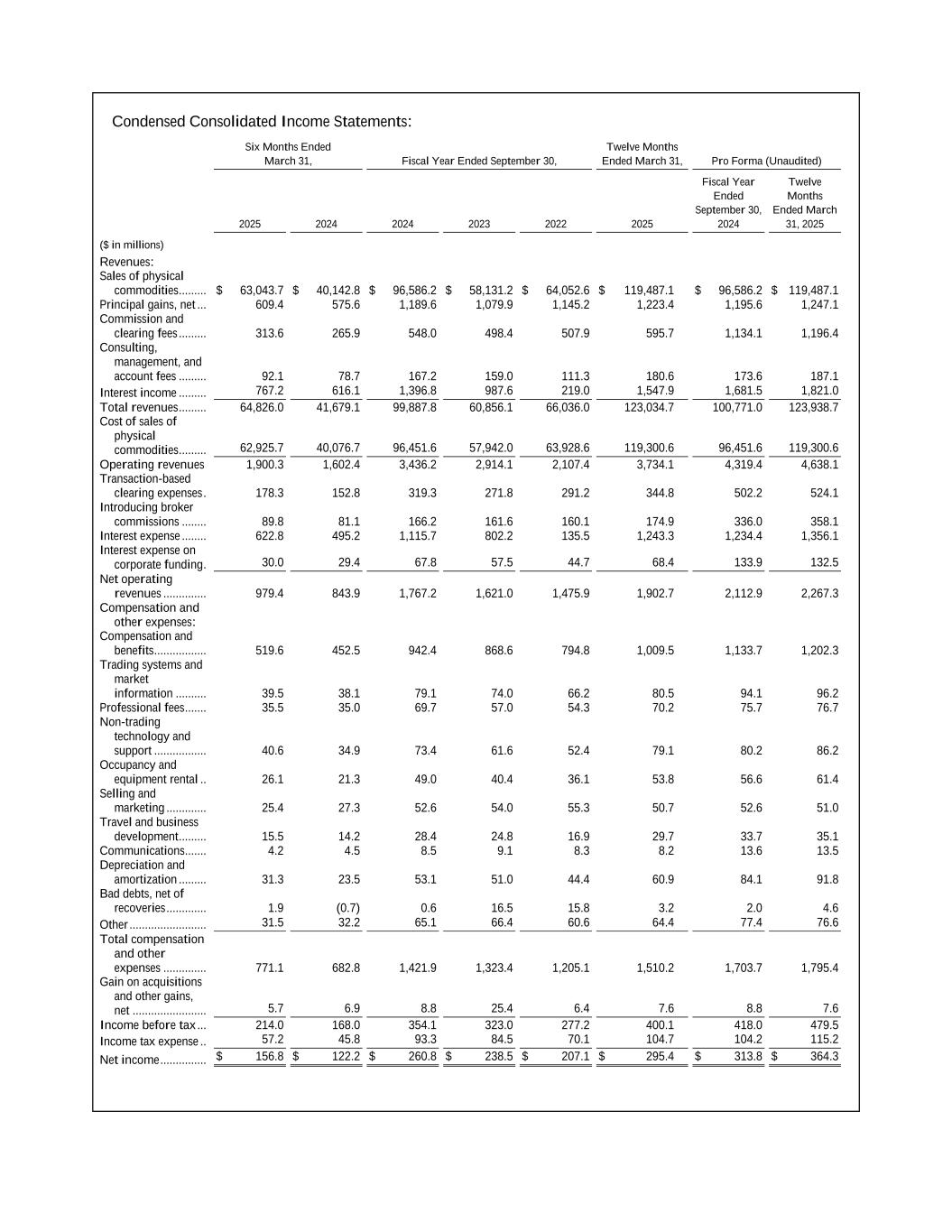 Condensed Consolidated Income Statements: Six Months Ended March 31, Fiscal Year Ended September 30, Twelve Months Ended March 31, Pro Forma (Unaudited) 2025 2024 2024 2023 2022 2025 Fiscal Year Ended September 30, 2024 Twelve Months Ended March 31, 2025 ($ in millions) Revenues: Sales of physical commodities ......... $ 63,043.7 $ 40,142.8 $ 96,586.2 $ 58,131.2 $ 64,052.6 $ 119,487.1 $ 96,586.2 $ 119,487.1 Principal gains, net ... 609.4 575.6 1,189.6 1,079.9 1,145.2 1,223.4 1,195.6 1,247.1 Commission and clearing fees ......... 313.6 265.9 548.0 498.4 507.9 595.7 1,134.1 1,196.4 Consulting, management, and account fees ......... 92.1 78.7 167.2 159.0 111.3 180.6 173.6 187.1 Interest income ......... 767.2 616.1 1,396.8 987.6 219.0 1,547.9 1,681.5 1,821.0 Total revenues ......... 64,826.0 41,679.1 99,887.8 60,856.1 66,036.0 123,034.7 100,771.0 123,938.7 Cost of sales of physical commodities ......... 62,925.7 40,076.7 96,451.6 57,942.0 63,928.6 119,300.6 96,451.6 119,300.6 Operating revenues 1,900.3 1,602.4 3,436.2 2,914.1 2,107.4 3,734.1 4,319.4 4,638.1 Transaction-based clearing expenses . 178.3 152.8 319.3 271.8 291.2 344.8 502.2 524.1 Introducing broker commissions ........ 89.8 81.1 166.2 161.6 160.1 174.9 336.0 358.1 Interest expense ........ 622.8 495.2 1,115.7 802.2 135.5 1,243.3 1,234.4 1,356.1 Interest expense on corporate funding . 30.0 29.4 67.8 57.5 44.7 68.4 133.9 132.5 Net operating revenues .............. 979.4 843.9 1,767.2 1,621.0 1,475.9 1,902.7 2,112.9 2,267.3 Compensation and other expenses: Compensation and benefits ................. 519.6 452.5 942.4 868.6 794.8 1,009.5 1,133.7 1,202.3 Trading systems and market information .......... 39.5 38.1 79.1 74.0 66.2 80.5 94.1 96.2 Professional fees ....... 35.5 35.0 69.7 57.0 54.3 70.2 75.7 76.7 Non-trading technology and support ................. 40.6 34.9 73.4 61.6 52.4 79.1 80.2 86.2 Occupancy and equipment rental .. 26.1 21.3 49.0 40.4 36.1 53.8 56.6 61.4 Selling and marketing ............. 25.4 27.3 52.6 54.0 55.3 50.7 52.6 51.0 Travel and business development ......... 15.5 14.2 28.4 24.8 16.9 29.7 33.7 35.1 Communications ....... 4.2 4.5 8.5 9.1 8.3 8.2 13.6 13.5 Depreciation and amortization ......... 31.3 23.5 53.1 51.0 44.4 60.9 84.1 91.8 Bad debts, net of recoveries ............. 1.9 (0.7) 0.6 16.5 15.8 3.2 2.0 4.6 Other ......................... 31.5 32.2 65.1 66.4 60.6 64.4 77.4 76.6 Total compensation and other expenses .............. 771.1 682.8 1,421.9 1,323.4 1,205.1 1,510.2 1,703.7 1,795.4 Gain on acquisitions and other gains, net ........................ 5.7 6.9 8.8 25.4 6.4 7.6 8.8 7.6 Income before tax ... 214.0 168.0 354.1 323.0 277.2 400.1 418.0 479.5 Income tax expense .. 57.2 45.8 93.3 84.5 70.1 104.7 104.2 115.2 Net income ............... $ 156.8 $ 122.2 $ 260.8 $ 238.5 $ 207.1 $ 295.4 $ 313.8 $ 364.3