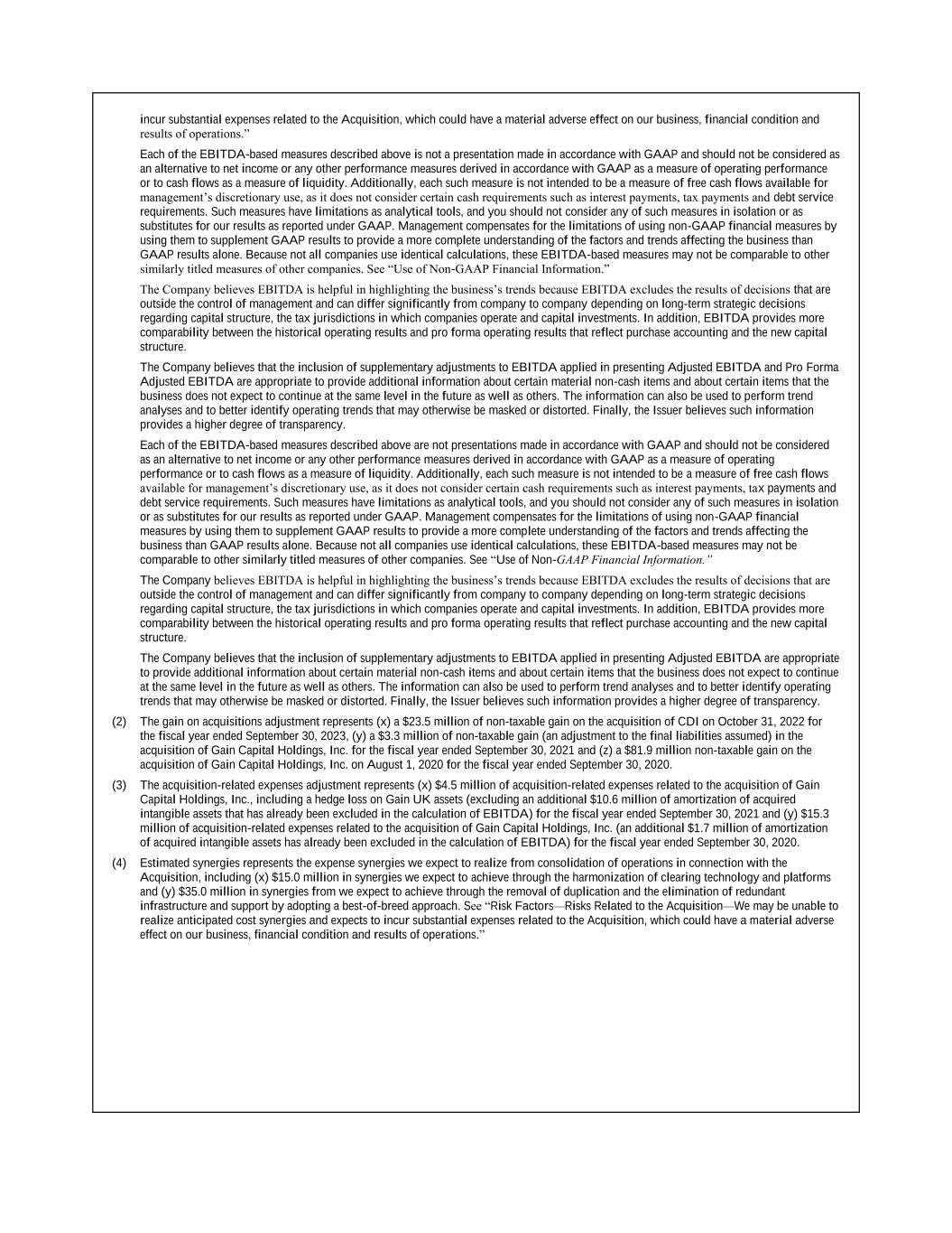 incur substantial expenses related to the Acquisition, which could have a material adverse effect on our business, financial condition and results of operations.” Each of the EBITDA-based measures described above is not a presentation made in accordance with GAAP and should not be considered as an alternative to net income or any other performance measures derived in accordance with GAAP as a measure of operating performance or to cash flows as a measure of liquidity. Additionally, each such measure is not intended to be a measure of free cash flows available for management’s discretionary use, as it does not consider certain cash requirements such as interest payments, tax payments and debt service requirements. Such measures have limitations as analytical tools, and you should not consider any of such measures in isolation or as substitutes for our results as reported under GAAP. Management compensates for the limitations of using non-GAAP financial measures by using them to supplement GAAP results to provide a more complete understanding of the factors and trends affecting the business than GAAP results alone. Because not all companies use identical calculations, these EBITDA-based measures may not be comparable to other similarly titled measures of other companies. See “Use of Non-GAAP Financial Information.” The Company believes EBITDA is helpful in highlighting the business’s trends because EBITDA excludes the results of decisions that are outside the control of management and can differ significantly from company to company depending on long-term strategic decisions regarding capital structure, the tax jurisdictions in which companies operate and capital investments. In addition, EBITDA provides more comparability between the historical operating results and pro forma operating results that reflect purchase accounting and the new capital structure. The Company believes that the inclusion of supplementary adjustments to EBITDA applied in presenting Adjusted EBITDA and Pro Forma Adjusted EBITDA are appropriate to provide additional information about certain material non-cash items and about certain items that the business does not expect to continue at the same level in the future as well as others. The information can also be used to perform trend analyses and to better identify operating trends that may otherwise be masked or distorted. Finally, the Issuer believes such information provides a higher degree of transparency. Each of the EBITDA-based measures described above are not presentations made in accordance with GAAP and should not be considered as an alternative to net income or any other performance measures derived in accordance with GAAP as a measure of operating performance or to cash flows as a measure of liquidity. Additionally, each such measure is not intended to be a measure of free cash flows available for management’s discretionary use, as it does not consider certain cash requirements such as interest payments, tax payments and debt service requirements. Such measures have limitations as analytical tools, and you should not consider any of such measures in isolation or as substitutes for our results as reported under GAAP. Management compensates for the limitations of using non-GAAP financial measures by using them to supplement GAAP results to provide a more complete understanding of the factors and trends affecting the business than GAAP results alone. Because not all companies use identical calculations, these EBITDA-based measures may not be comparable to other similarly titled measures of other companies. See “Use of Non-GAAP Financial Information.” The Company believes EBITDA is helpful in highlighting the business’s trends because EBITDA excludes the results of decisions that are outside the control of management and can differ significantly from company to company depending on long-term strategic decisions regarding capital structure, the tax jurisdictions in which companies operate and capital investments. In addition, EBITDA provides more comparability between the historical operating results and pro forma operating results that reflect purchase accounting and the new capital structure. The Company believes that the inclusion of supplementary adjustments to EBITDA applied in presenting Adjusted EBITDA are appropriate to provide additional information about certain material non-cash items and about certain items that the business does not expect to continue at the same level in the future as well as others. The information can also be used to perform trend analyses and to better identify operating trends that may otherwise be masked or distorted. Finally, the Issuer believes such information provides a higher degree of transparency. (2) The gain on acquisitions adjustment represents (x) a $23.5 million of non-taxable gain on the acquisition of CDI on October 31, 2022 for the fiscal year ended September 30, 2023, (y) a $3.3 million of non-taxable gain (an adjustment to the final liabilities assumed) in the acquisition of Gain Capital Holdings, Inc. for the fiscal year ended September 30, 2021 and (z) a $81.9 million non-taxable gain on the acquisition of Gain Capital Holdings, Inc. on August 1, 2020 for the fiscal year ended September 30, 2020. (3) The acquisition-related expenses adjustment represents (x) $4.5 million of acquisition-related expenses related to the acquisition of Gain Capital Holdings, Inc., including a hedge loss on Gain UK assets (excluding an additional $10.6 million of amortization of acquired intangible assets that has already been excluded in the calculation of EBITDA) for the fiscal year ended September 30, 2021 and (y) $15.3 million of acquisition-related expenses related to the acquisition of Gain Capital Holdings, Inc. (an additional $1.7 million of amortization of acquired intangible assets has already been excluded in the calculation of EBITDA) for the fiscal year ended September 30, 2020. (4) Estimated syner