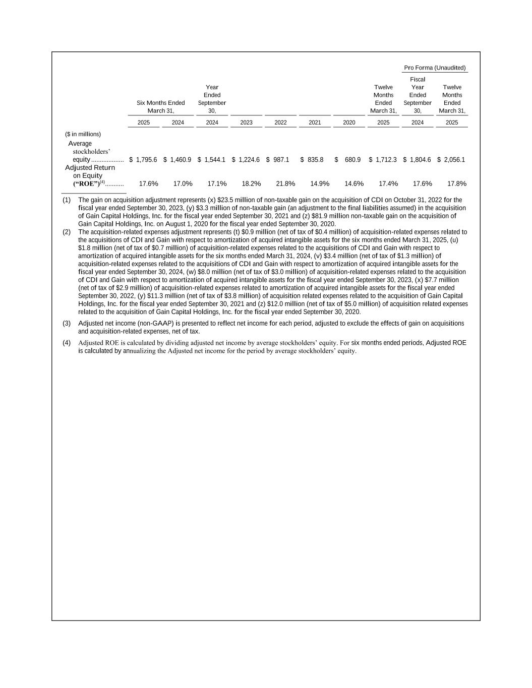 Pro Forma (Unaudited) Six Months Ended March 31, Year Ended September 30, Twelve Months Ended March 31, Fiscal Year Ended September 30, Twelve Months Ended March 31, 2025 2024 2024 2023 2022 2021 2020 2025 2024 2025 ($ in millions) Average stockholders’ equity ................... $ 1,795.6 $ 1,460.9 $ 1,544.1 $ 1,224.6 $ 987.1 $ 835.8 $ 680.9 $ 1,712.3 $ 1,804.6 $ 2,056.1 Adjusted Return on Equity (“ROE”)(4) ........... 17.6% 17.0% 17.1% 18.2% 21.8% 14.9% 14.6% 17.4% 17.6% 17.8% (1) The gain on acquisition adjustment represents (x) $23.5 million of non-taxable gain on the acquisition of CDI on October 31, 2022 for the fiscal year ended September 30, 2023, (y) $3.3 million of non-taxable gain (an adjustment to the final liabilities assumed) in the acquisition of Gain Capital Holdings, Inc. for the fiscal year ended September 30, 2021 and (z) $81.9 million non-taxable gain on the acquisition of Gain Capital Holdings, Inc. on August 1, 2020 for the fiscal year ended September 30, 2020. (2) The acquisition-related expenses adjustment represents (t) $0.9 million (net of tax of $0.4 million) of acquisition-related expenses related to the acquisitions of CDI and Gain with respect to amortization of acquired intangible assets for the six months ended March 31, 2025, (u) $1.8 million (net of tax of $0.7 million) of acquisition-related expenses related to the acquisitions of CDI and Gain with respect to amortization of acquired intangible assets for the six months ended March 31, 2024, (v) $3.4 million (net of tax of $1.3 million) of acquisition-related expenses related to the acquisitions of CDI and Gain with respect to amortization of acquired intangible assets for the fiscal year ended September 30, 2024, (w) $8.0 million (net of tax of $3.0 million) of acquisition-related expenses related to the acquisition of CDI and Gain with respect to amortization of acquired intangible assets for the fiscal year ended September 30, 2023, (x) $7.7 million (net of tax of $2.9 million) of acquisition-related expenses related to amortization of acquired intangible assets for the fiscal year ended September 30, 2022, (y) $11.3 million (net of tax of $3.8 million) of acquisition related expenses related to the acquisition of Gain Capital Holdings, Inc. for the fiscal year ended September 30, 2021 and (z) $12.0 million (net of tax of $5.0 million) of acquisition related expenses related to the acquisition of Gain Capital Holdings, Inc. for the fiscal year ended September 30, 2020. (3) Adjusted net income (non-GAAP) is presented to reflect net income for each period, adjusted to exclude the effects of gain on acquisitions and acquisition-related expenses, net of tax. (4) Adjusted ROE is calculated by dividing adjusted net income by average stockholders’ equity. For six months ended periods, Adjusted ROE is calculated by annualizing the Adjusted net income for the period by average stockholders’ equity.