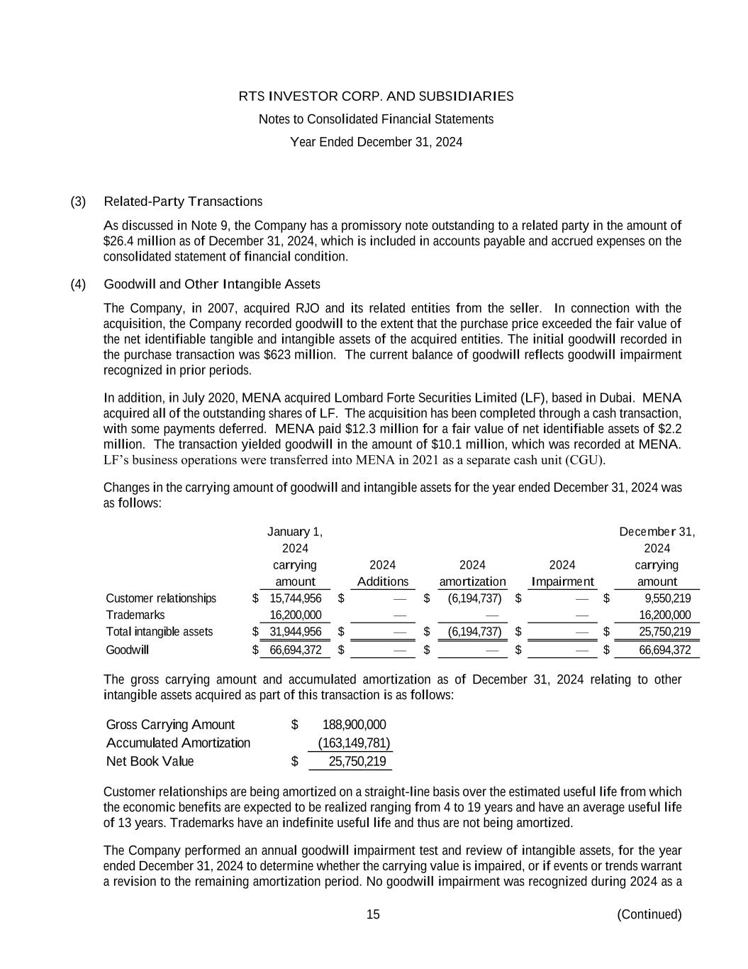 RTS INVESTOR CORP. AND SUBSIDIARIES Notes to Consolidated Financial Statements Year Ended December 31, 2024 15 (Continued) (3) Related-Party Transactions As discussed in Note 9, the Company has a promissory note outstanding to a related party in the amount of $26.4 million as of December 31, 2024, which is included in accounts payable and accrued expenses on the consolidated statement of financial condition. (4) Goodwill and Other Intangible Assets The Company, in 2007, acquired RJO and its related entities from the seller. In connection with the acquisition, the Company recorded goodwill to the extent that the purchase price exceeded the fair value of the net identifiable tangible and intangible assets of the acquired entities. The initial goodwill recorded in the purchase transaction was $623 million. The current balance of goodwill reflects goodwill impairment recognized in prior periods. In addition, in July 2020, MENA acquired Lombard Forte Securities Limited (LF), based in Dubai. MENA acquired all of the outstanding shares of LF. The acquisition has been completed through a cash transaction, with some payments deferred. MENA paid $12.3 million for a fair value of net identifiable assets of $2.2 million. The transaction yielded goodwill in the amount of $10.1 million, which was recorded at MENA. LF’s business operations were transferred into MENA in 2021 as a separate cash unit (CGU). Changes in the carrying amount of goodwill and intangible assets for the year ended December 31, 2024 was as follows: The gross carrying amount and accumulated amortization as of December 31, 2024 relating to other intangible assets acquired as part of this transaction is as follows: Customer relationships are being amortized on a straight-line basis over the estimated useful life from which the economic benefits are expected to be realized ranging from 4 to 19 years and have an average useful life of 13 years. Trademarks have an indefinite useful life and thus are not being amortized. The Company performed an annual goodwill impairment test and review of intangible assets, for the year ended December 31, 2024 to determine whether the carrying value is impaired, or if events or trends warrant a revision to the remaining amortization period. No goodwill impairment was recognized during 2024 as a January 1, December 31, 2024 2024 carrying 2024 2024 2024 carrying amount Additions amortization Impairment amount Customer relationships $ 15,744,956 $ — $ (6,194,737) $ — $ 9,550,219 Trademarks 16,200,000 — — — 16,200,000 Total intangible assets $ 31,944,956 $ — $ (6,194,737) $ — $ 25,750,219 Goodwill $ 66,694,372 $ — $ — $ — $ 66,694,372 Gross Carrying Amount $ 188,900,000 Accumulated Amortization (163,149,781) Net Book Value $ 25,750,219