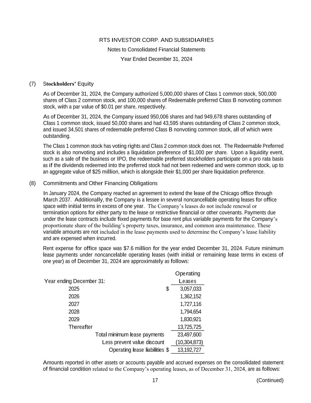 RTS INVESTOR CORP. AND SUBSIDIARIES Notes to Consolidated Financial Statements Year Ended December 31, 2024 17 (Continued) (7) Stockholders’ Equity As of December 31, 2024, the Company authorized 5,000,000 shares of Class 1 common stock, 500,000 shares of Class 2 common stock, and 100,000 shares of Redeemable preferred Class B nonvoting common stock, with a par value of $0.01 per share, respectively. As of December 31, 2024, the Company issued 950,006 shares and had 949,678 shares outstanding of Class 1 common stock, issued 50,000 shares and had 43,595 shares outstanding of Class 2 common stock, and issued 34,501 shares of redeemable preferred Class B nonvoting common stock, all of which were outstanding. The Class 1 common stock has voting rights and Class 2 common stock does not. The Redeemable Preferred stock is also nonvoting and includes a liquidation preference of $1,000 per share. Upon a liquidity event, such as a sale of the business or IPO, the redeemable preferred stockholders participate on a pro rata basis as if the dividends redeemed into the preferred stock had not been redeemed and were common stock, up to an aggregate value of $25 million, which is alongside their $1,000 per share liquidation preference. (8) Commitments and Other Financing Obligations In January 2024, the Company reached an agreement to extend the lease of the Chicago office through March 2037. Additionally, the Company is a lessee in several noncancellable operating leases for office space with initial terms in excess of one year. The Company’s leases do not include renewal or termination options for either party to the lease or restrictive financial or other covenants. Payments due under the lease contracts include fixed payments for base rent plus variable payments for the Company’s proportionate share of the building’s property taxes, insurance, and common area maintenance. These variable amounts are not included in the lease payments used to determine the Company’s lease liability and are expensed when incurred. Rent expense for office space was $7.6 million for the year ended December 31, 2024. Future minimum lease payments under noncancelable operating leases (with initial or remaining lease terms in excess of one year) as of December 31, 2024 are approximately as follows: Amounts reported in other assets or accounts payable and accrued expenses on the consolidated statement of financial condition related to the Company’s operating leases, as of December 31, 2024, are as follows: Operating Year ending December 31: Leases 2025 $ 3,057,033 2026 1,362,152 2027 1,727,116 2028 1,794,654 2029 1,830,921 Thereafter 13,725,725 Total minimum lease payments 23,497,600 Less prevent value discount (10,304,873) Operating lease liabilities $ 13,192,727