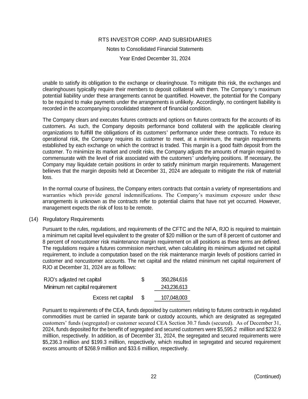 RTS INVESTOR CORP. AND SUBSIDIARIES Notes to Consolidated Financial Statements Year Ended December 31, 2024 22 (Continued) unable to satisfy its obligation to the exchange or clearinghouse. To mitigate this risk, the exchanges and clearinghouses typically require their members to deposit collateral with them. The Company’s maximum potential liability under these arrangements cannot be quantified. However, the potential for the Company to be required to make payments under the arrangements is unlikely. Accordingly, no contingent liability is recorded in the accompanying consolidated statement of financial condition. The Company clears and executes futures contracts and options on futures contracts for the accounts of its customers. As such, the Company deposits performance bond collateral with the applicable clearing organizations to fulfill the obligations of its customers’ performance under these contracts. To reduce its operational risk, the Company requires its customer to meet, at a minimum, the margin requirements established by each exchange on which the contract is traded. This margin is a good faith deposit from the customer. To minimize its market and credit risks, the Company adjusts the amounts of margin required to commensurate with the level of risk associated with the customers’ underlying positions. If necessary, the Company may liquidate certain positions in order to satisfy minimum margin requirements. Management believes that the margin deposits held at December 31, 2024 are adequate to mitigate the risk of material loss. In the normal course of business, the Company enters contracts that contain a variety of representations and warranties which provide general indemnifications. The Company’s maximum exposure under these arrangements is unknown as the contracts refer to potential claims that have not yet occurred. However, management expects the risk of loss to be remote. (14) Regulatory Requirements Pursuant to the rules, regulations, and requirements of the CFTC and the NFA, RJO is required to maintain a minimum net capital level equivalent to the greater of $20 million or the sum of 8 percent of customer and 8 percent of noncustomer risk maintenance margin requirement on all positions as these terms are defined. The regulations require a futures commission merchant, when calculating its minimum adjusted net capital requirement, to include a computation based on the risk maintenance margin levels of positions carried in customer and noncustomer accounts. The net capital and the related minimum net capital requirement of RJO at December 31, 2024 are as follows: Pursuant to requirements of the CEA, funds deposited by customers relating to futures contracts in regulated commodities must be carried in separate bank or custody accounts, which are designated as segregated customers’ funds (segregated) or customer secured CEA Section 30.7 funds (secured). As of December 31, 2024, funds deposited for the benefit of segregated and secured customers were $5,595.2 million and $232.9 million, respectively. In addition, as of December 31, 2024, the segregated and secured requirements were $5,236.3 million and $199.3 million, respectively, which resulted in segregated and secured requirement excess amounts of $268.9 million and $33.6 million, respectively. RJO's adjusted net capital $ 350,284,616 Minimum net capital requirement 243,236,613 Excess net capital $ 107,048,003