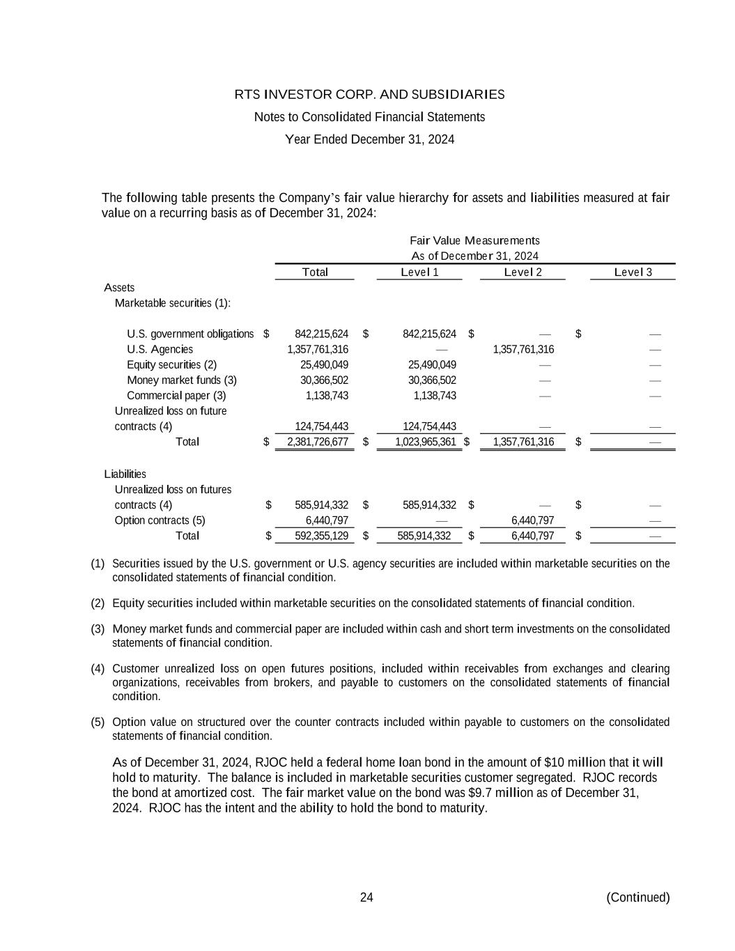 RTS INVESTOR CORP. AND SUBSIDIARIES Notes to Consolidated Financial Statements Year Ended December 31, 2024 24 (Continued) The following table presents the Company’s fair value hierarchy for assets and liabilities measured at fair value on a recurring basis as of December 31, 2024: (1) Securities issued by the U.S. government or U.S. agency securities are included within marketable securities on the consolidated statements of financial condition. (2) Equity securities included within marketable securities on the consolidated statements of financial condition. (3) Money market funds and commercial paper are included within cash and short term investments on the consolidated statements of financial condition. (4) Customer unrealized loss on open futures positions, included within receivables from exchanges and clearing organizations, receivables from brokers, and payable to customers on the consolidated statements of financial condition. (5) Option value on structured over the counter contracts included within payable to customers on the consolidated statements of financial condition. As of December 31, 2024, RJOC held a federal home loan bond in the amount of $10 million that it will hold to maturity. The balance is included in marketable securities customer segregated. RJOC records the bond at amortized cost. The fair market value on the bond was $9.7 million as of December 31, 2024. RJOC has the intent and the ability to hold the bond to maturity. Total Level 1 Level 2 Level 3 Assets Marketable securities (1): U.S. government obligations $ 842,215,624 $ 842,215,624 $ — $ — U.S. Agencies 1,357,761,316 — 1,357,761,316 — Equity securities (2) 25,490,049 25,490,049 — — Money market funds (3) 30,366,502 30,366,502 — — Commercial paper (3) 1,138,743 1,138,743 — — Unrealized loss on future contracts (4) 124,754,443 124,754,443 — — Total $ 2,381,726,677 $ 1,023,965,361 $ 1,357,761,316 $ — Liabilities Unrealized loss on futures contracts (4) $ 585,914,332 $ 585,914,332 $ — $ — Option contracts (5) 6,440,797 — 6,440,797 — Total $ 592,355,129 $ 585,914,332 $ 6,440,797 $ — Fair Value Measurements As of December 31, 2024