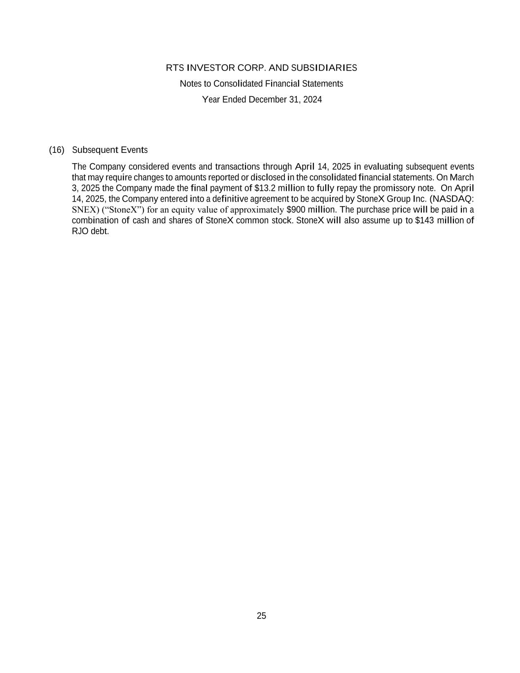 RTS INVESTOR CORP. AND SUBSIDIARIES Notes to Consolidated Financial Statements Year Ended December 31, 2024 25 (16) Subsequent Events The Company considered events and transactions through April 14, 2025 in evaluating subsequent events that may require changes to amounts reported or disclosed in the consolidated financial statements. On March 3, 2025 the Company made the final payment of $13.2 million to fully repay the promissory note. On April 14, 2025, the Company entered into a definitive agreement to be acquired by StoneX Group Inc. (NASDAQ: SNEX) (“StoneX”) for an equity value of approximately $900 million. The purchase price will be paid in a combination of cash and shares of StoneX common stock. StoneX will also assume up to $143 million of RJO debt.