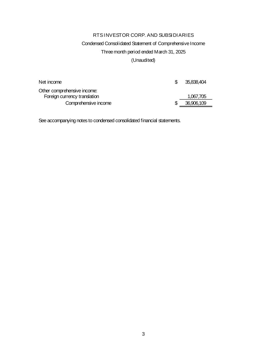 RTS INVESTOR CORP. AND SUBSIDIARIES Condensed Consolidated Statement of Comprehensive Income Three month period ended March 31, 2025 (Unaudited) 3 Net income $ 35,838,404 Other comprehensive income: Foreign currency translation 1,067,705 Comprehensive income $ 36,906,109 See accompanying notes to condensed consolidated financial statements.
