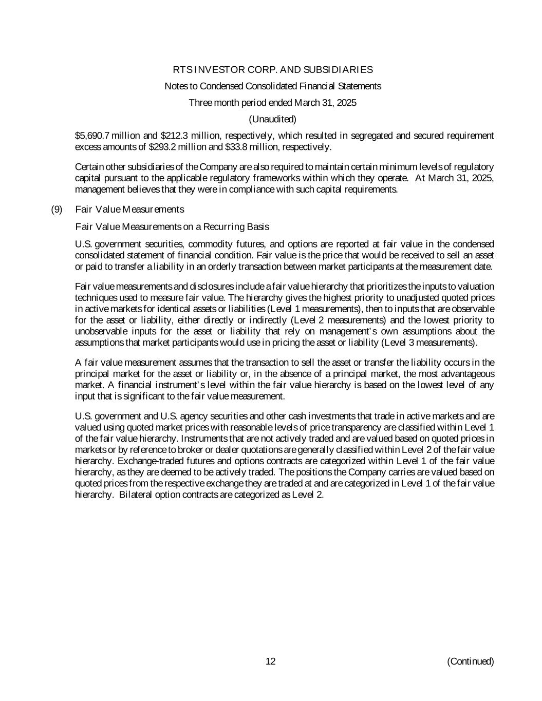 RTS INVESTOR CORP. AND SUBSIDIARIES Notes to Condensed Consolidated Financial Statements Three month period ended March 31, 2025 (Unaudited) 12 (Continued) $5,690.7 million and $212.3 million, respectively, which resulted in segregated and secured requirement excess amounts of $293.2 million and $33.8 million, respectively. Certain other subsidiaries of the Company are also required to maintain certain minimum levels of regulatory capital pursuant to the applicable regulatory frameworks within which they operate. At March 31, 2025, management believes that they were in compliance with such capital requirements. (9) Fair Value Measurements Fair Value Measurements on a Recurring Basis U.S. government securities, commodity futures, and options are reported at fair value in the condensed consolidated statement of financial condition. Fair value is the price that would be received to sell an asset or paid to transfer a liability in an orderly transaction between market participants at the measurement date. Fair value measurements and disclosures include a fair value hierarchy that prioritizes the inputs to valuation techniques used to measure fair value. The hierarchy gives the highest priority to unadjusted quoted prices in active markets for identical assets or liabilities (Level 1 measurements), then to inputs that are observable for the asset or liability, either directly or indirectly (Level 2 measurements) and the lowest priority to unobservable inputs for the asset or liability that rely on management’s own assumptions about the assumptions that market participants would use in pricing the asset or liability (Level 3 measurements). A fair value measurement assumes that the transaction to sell the asset or transfer the liability occurs in the principal market for the asset or liability or, in the absence of a principal market, the most advantageous market. A financial instrument’s level within the fair value hierarchy is based on the lowest level of any input that is significant to the fair value measurement. U.S. government and U.S. agency securities and other cash investments that trade in active markets and are valued using quoted market prices with reasonable levels of price transparency are classified within Level 1 of the fair value hierarchy. Instruments that are not actively traded and are valued based on quoted prices in markets or by reference to broker or dealer quotations are generally classified within Level 2 of the fair value hierarchy. Exchange-traded futures and options contracts are categorized within Level 1 of the fair value hierarchy, as they are deemed to be actively traded. The positions the Company carries are valued based on quoted prices from the respective exchange they are traded at and are categorized in Level 1 of the fair value hierarchy. Bilateral option contracts are categorized as Level 2.