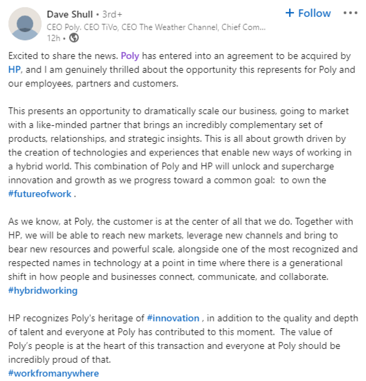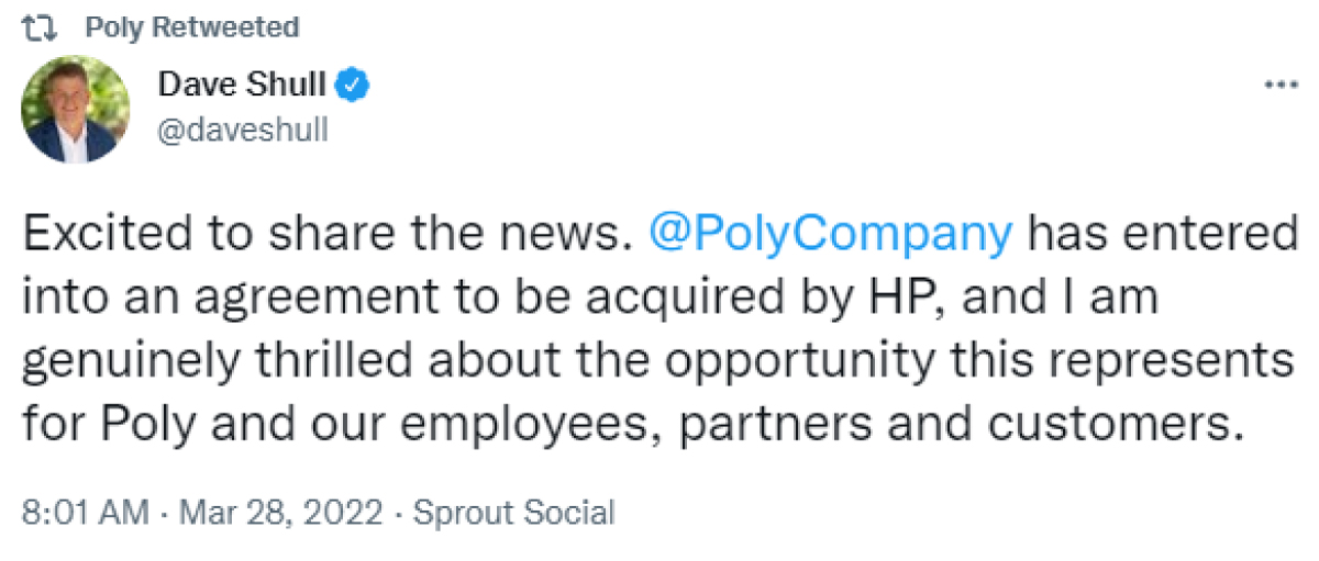 Excited to share the news. @Poly has entered into an agreement to be acquired by HP, and I am genuinely thrilled about the opportunity this represents for Poly and our employees, partners and customers.