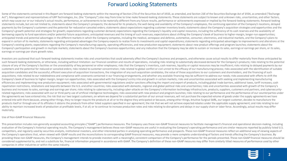 Forward Looking Statements 2 Some of the statements contained in this Report are forward - looking statements within the meaning of Section 27A of the Securiti es Act of 1933, as amended, and Section 21E of the Securities Exchange Act of 1934, as amended (“Exchange Act”). Management and representatives of UFP Technologies, Inc. (the “Company”) also may from time to time make forward - looking statements. These statements are subject to known and unknown risks, uncertainties, and other factors, which may cause our or our industry’s actual results, performance, or achievements to be materially different from any future re sults, performance or achievements expressed or implied by the forward - looking statements. Forward - looking statements include, but are not limited to, statements about the Company’s prospects; the demand for its products, the well - bein g and availability of the Company’s employees, the continuing operation of the Company’s locations, delayed payments by the Company’s customers and the potential for reduced or canceled orders; statements about expectations regarding cu stomer inventory levels; statements about the Company’s acquisition strategies and opportunities and the Company’s growth potential and strategies for growth; expectations regarding customer demand; expectations regarding the Comp any ’s liquidity and capital resources, including the sufficiency of its cash reserves and the availability of borrowing capacity to fund operations and/or potential future acquisitions; anticipated revenues and the timing of such reven ues ; expectations about shifting the Company’s book of business to higher - margin, longer - run opportunities; anticipated trends and potential advantages in the different markets in which the Company competes, including the medical, ae ros pace and defense, automotive, consumer, electronics, and industrial markets, and the Company’s plans to expand in certain of its markets; statements regarding anticipated advantages the Company expects to realize from its investm ent s and capital expenditures; statements regarding anticipated advantages to improvements and alterations at the Company’s existing plants; expectations regarding the Company’s manufacturing capacity, operating efficiencies, and new produ cti on equipment; statements about new product offerings and program launches; statements about the Company’s participation and growth in multiple markets; statements about the Company’s business opportunities; and any indica tio n that the Company may be able to sustain or increase its sales, earnings or earnings per share, or its sales, earnings or earnings per share growth rates. Investors are cautioned that such forward - looking statements involve risks and uncertainties that could adversely affect the Com pany’s business and prospects, and otherwise cause actual results to differ materially from those anticipated by such forward - looking statements, or otherwise, including without limitation: our financial condition and results of operations, including risks relating to substantially decreased demand for the Company’s products; risks relating to the potential closure of any of the Company’s facilities or the unavailability of key personnel or other employees; risks that the Company’ s i nventory, cash reserves, liquidity or capital resources may be insufficient; risks relating to delayed payments by our customers and the potential for reduced or canceled orders; risks related to customer concentration; risks related to global con flict or civil unrest to the efficacy of our manufacturing process; risks associated with the identification of suitable acquisition candidates and the successful, efficient execution of acquisition transactions, the integration of any such acqui sit ion candidates, the value of those acquisitions to our customers and shareholders, and the financing of such acquisitions; risks related to our indebtedness and compliance with covenants contained in our financing arrangements, and wh eth er any available financing may be sufficient to address our needs; risks associated with efforts to shift the Company’s book of business to higher - margin, longer - run opportunities; risks associated with the Company’s entry into and growth in certain markets; risks and uncertainties associated with seeking and implementing manufacturing efficiencies and implementing new production equipment; risks associated with governmental regulations and/or sanctions affec tin g the import and export of products, including global trade barriers, additional taxes, tariff increases, cash repatriation restrictions, retaliations and boycotts between the U.S. and other countries; risks associated with domestic, re gio nal and global political risks and uncertainties; risks and uncertainties associated with growth of the Company’s business and increases to sales, earnings and earnings per share; risks relating to cybersecurity, including cyber - attacks on th e Company’s information technology infrastructure, products, suppliers, customers and partners, and cybersecurity - related regulations; risks associated with our or third - party use of artificial intelligence technologies; risks associated with new product and program launches; risks relating to our performance and the performance of our counterparties under the agreements we have entered into; the risk that our two largest customers, on whom we depend for a substantial portion of our annual revenues, will not purchase the expected volume of goods under the supply agreements we have entered into with them because, among other things, they no longer require the products at all or to the degree they anticipa ted or because, among other things, Intuitive Surgical SARL, our largest customer, decides to manufacture the products itself or through one of its affiliates it obtains the products from other listed suppliers specified in our agreeme 