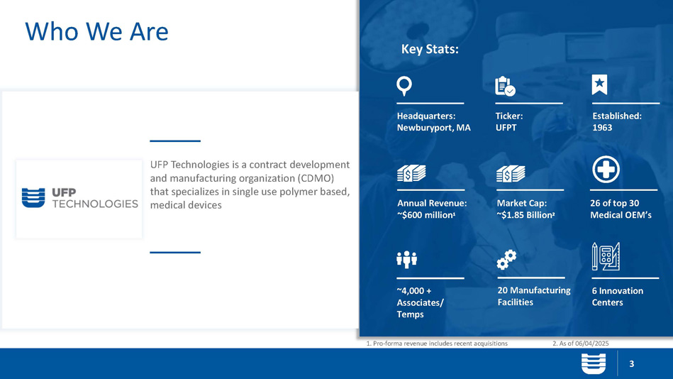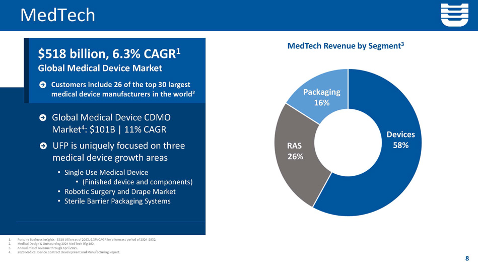$518 billion, 6.3% CAGR 1 Global Medical Device Market Customers include 26 of the top 30 largest medical device manufacturers in the world 2 1. Fortune Business Insights - $518 billion as of 2023. 6.3% CAGR for a forecast period of 2024 - 2032. 2. Medical Design & Outsourcing 2024 MedTech Big 100. 3. Annual mix of revenue through April 2025. 4. 2020 Medical Device Contract Development and Manufacturing Report. MedTech MedTech Revenue by Segment 3 Global Medical Device CDMO Market 4 : $101B | 11% CAGR • Single Use Medical Device • (Finished device and components) • Robotic Surgery and Drape Market • Sterile Barrier Packaging Systems UFP is uniquely focused on three medical device growth areas 8 Devices 58% RAS 26% Packaging 16%