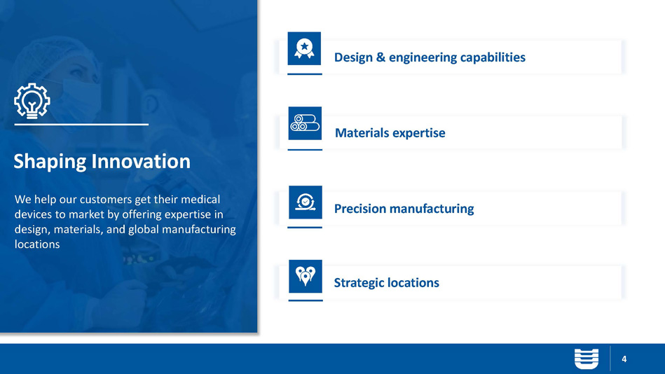 Who We Are UFP Technologies is a contract development and manufacturing organization (CDMO) that specializes in single use polymer based, medical devices 3 Ticker: UFPT Headquarters: Newburyport, MA Annual Revenue: ~$ 600 million 1 ~4,000 + Associates/ Temps Established: 1963 20 Manufacturing Facilities Key Stats: 6 Innovation Centers Market Cap: ~$ 1.85 Billion 2 26 of top 30 Medical OEM’s 1 . Pro - forma revenue includes recent acquisitions 2. As of 06/04/2025