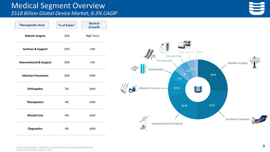 Medical Segment Overview $518 Billion Global Device Market, 6.3% CAGR 1 Therapeutic Area % of Sales 2 1 Fortune Business Insights - $518 billion as of 2023. 6.3% CAGR for a forecast period of 2024 - 2032. 2 Annual mix of revenue through April, 2025 Market Growth High Teens 26% Robotic Surgery LDD 25% Surfaces & Support LSD 20% Interventional & Surgical MSD 10% Infection Prevention MSD 5% Orthopedics MSD 4% Therapeutics MSD 4% Wound Care MSD 4% Diagnostics 9