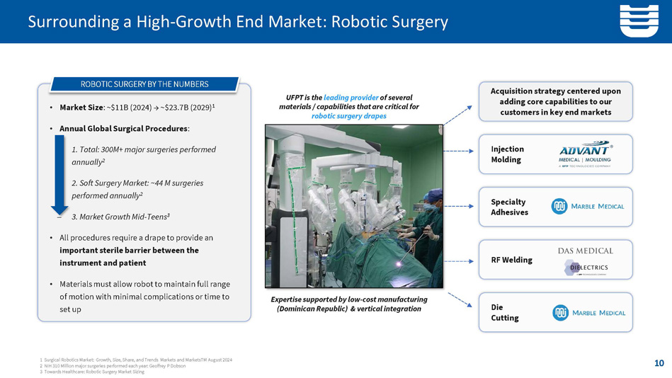 Surrounding a High - Growth End Market: Robotic Surgery 1 Surgical Robotics Market: Growth, Size, Share, and Trends Markets and MarketsTM August 2024 2 NIH 310 Million major surgeries performed each year: Geoffrey P Dobson 3 Towards Healthcare: Robotic Surgery Market Sizing • Market Size : ~$11B (2024) → ~$ 23.7 B (2029) 1 • Annual Global Surgical Procedures : ̶ 1. Total: 300M+ major surgeries performed annually 2 ̶ 2. Soft Surgery Market: ~ 44 M surgeries performed annually 2 ̶ 3. Market Growth Mid - Teens 3 • All procedures require a drape to provide an important sterile barrier between the instrument and patient • Materials must allow robot to maintain full range of motion with minimal complications or time to set up Acquisition strategy centered upon adding core capabilities to our customers in key end markets UFPT is the leading provider of several materials / capabilities that are critical for robotic surgery drapes Expertise supported by low - cost manufacturing (Dominican Republic) & vertical integration Die Cutting Specialty Adhesives RF Welding Injection Molding ROBOTIC SURGERY BY THE NUMBERS 10