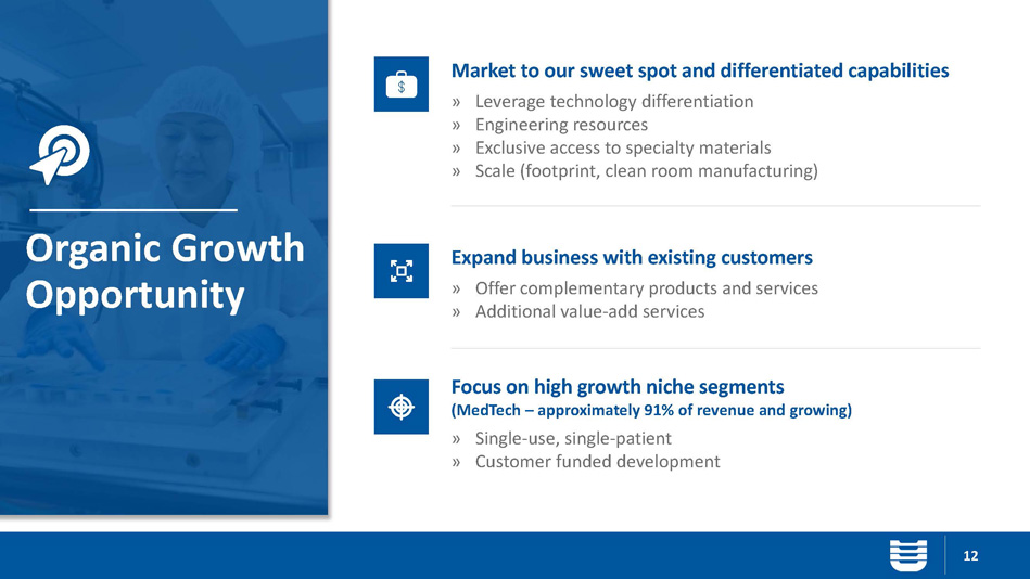 12 Organic Growth Opportunity Focus on high growth niche segments (MedTech – approximately 91% of revenue and growing) » Single - use, single - patient » Customer funded development Market to our sweet spot and differentiated capabilities » Leverage technology differentiation » Engineering resources » Exclusive access to specialty materials » Scale (footprint, clean room manufacturing) Expand business with existing customers » Offer complementary products and services » Additional value - add services