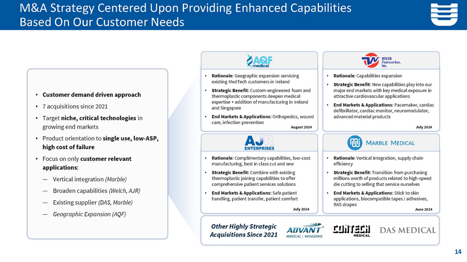 13 Acquisition Growth Opportunity Continue to Focus on Higher - Growth, Higher - Margin MedTech Opportunities that Create Value » Become more valuable to our customers » Strategic focus – new capability, geography, growing market segment, materials » Add scale » Look for synergistic opportunities » Cultural fit Goal is for acquisitions to be accretive within the first year. Experienced and disciplined management team with 19 acquisitions completed