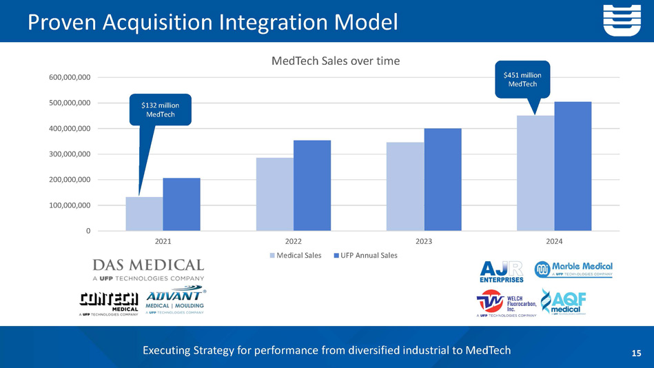 M&A Strategy Centered Upon Providing Enhanced Capabilities Based On Our Customer Needs • Customer demand driven approach • 7 acquisitions since 2021 • Target niche, critical technologies in growing end markets • Product orientation to single use, low - ASP, high cost of failure • Focus on only customer relevant applications : — Vertical integration (Marble) — Broaden capabilities (Welch, AJR) — Existing supplier (DAS, Marble) — Geographic Expansion (AQF) • Rationale : Capabilities expansion • Strategic Benefit : New capabilities play into our major end markets with key medical exposure in attractive cardiovascular applications • End Markets & Applications : Pacemaker, cardiac defibrillator, cardiac monitor, neuromodulator, advanced material products • Rationale : Geographic expansion servicing existing MedTech customers in Ireland • Strategic Benefit : Custom - engineered foam and thermoplastic components deepen medical expertise + addition of manufacturing in Ireland and Singapore • End Markets & Applications : Orthopedics, wound care, infection prevention • Rationale : Vertical integration, supply chain efficiency • Strategic Benefit : Transition from purchasing millions worth of products related to high - speed die cutting to selling that service ourselves • End Markets & Applications : Stick to skin applications, biocompatible tapes / adhesives, RAS drapes • Rationale : Complimentary capabilities, low - cost manufacturing, best in class cut and sew • Strategic Benefit : Combine with existing thermoplastic joining capabilities to offer comprehensive patient services solutions • End Markets & Applications : Safe patient handling, patient transfer, patient comfort July 2024 Other Highly Strategic Acquisitions Since 2021 August 2024 July 2024 June 2024 14