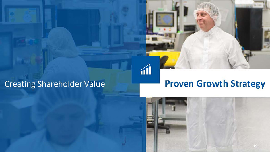 Competitive Advantage » Advanced systems (extensive quality certifications) » In addition to existing equipment, engineers will design product specific innovations in order to meet customer needs Quality & Regulatory » In - house custom equipment manufacturing capabilities Custom Equipment » Numerous patents relating to foam, packaging, tool control, radio frequency welding, automotive super - forming processes, and other products » Significant manufacturing knowhow Intellectual Property » Global footprint – competition is generally smaller companies that have limited resources and access to materials Scale » Veteran engineering team for product design and development; more than 100 members of the engineering group Engineering Resources » Exclusive access to several specialty medical grade materials » Offers broad array of materials to meet customer needs » Over 60 years in business and strong supplier relationships/partnerships Greater Access to Materials 18