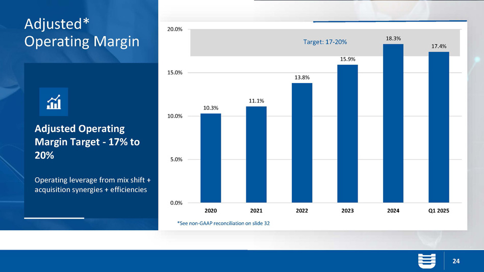 Gross Margin Target – 28% to 31% Operating Leverage from Mix Shift + Acquisition synergies + Efficiencies 23 Gross Profit Margin Target: 28 - 31% 24.9% 24.8% 25.5% 28.1% 29.1% 28.5% 18.0% 20.0% 22.0% 24.0% 26.0% 28.0% 30.0% 32.0% 2020 2021 2022 2023 2024 Q1 2025