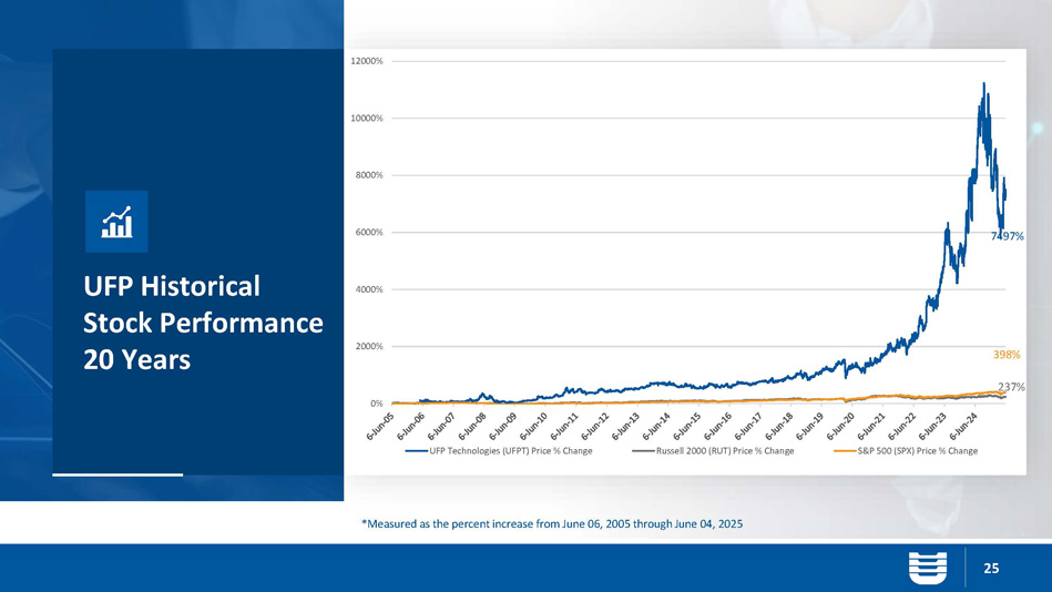 UFP Historical Stock Performance 20 Years 25 *Measured as the percent increase from June 06, 2005 through June 04, 2025 0% 2000% 4000% 6000% 8000% 10000% 12000% UFP Technologies (UFPT) Price % Change Russell 2000 (RUT) Price % Change S&P 500 (SPX) Price % Change 7497% 237% 398%