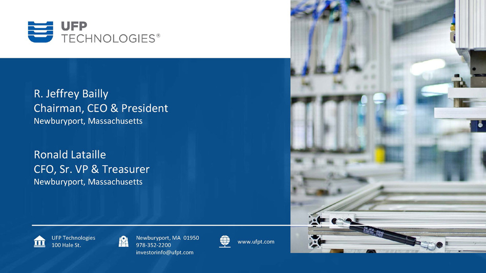R. Jeffrey Bailly Chairman, CEO & President Newburyport, Massachusetts Ronald Lataille CFO, Sr. VP & Treasurer Newburyport, Massachusetts UFP Technologies 100 Hale St. Newburyport, MA 01950 978 - 352 - 2200 investorinfo@ufpt.com www.ufpt.com