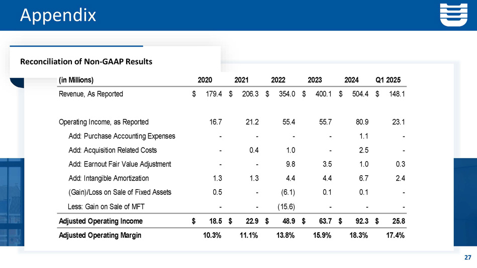 Appendix Reconciliation of Non - GAAP Results 27 (in Millions) 2020 2021 2022 2023 2024 Q1 2025 Revenue, As Reported $ 179.4 $ 206.3 $ 354.0 $ 400.1 $ 504.4 $ 148.1 Operating Income, as Reported 16.7 21.2 55.4 55.7 80.9 23.1 Add: Purchase Accounting Expenses - - - - 1.1 - Add: Acquisition Related Costs - 0.4 1.0 - 2.5 - Add: Earnout Fair Value Adjustment - - 9.8 3.5 1.0 0.3 Add: Intangible Amortization 1.3 1.3 4.4 4.4 6.7 2.4 (Gain)/Loss on Sale of Fixed Assets 0.5 - (6.1) 0.1 0.1 - Less: Gain on Sale of MFT - - (15.6) - - - Adjusted Operating Income $ 18.5 $ 22.9 $ 48.9 $ 63.7 $ 92.3 $ 25.8 Adjusted Operating Margin 10.3% 11.1% 13.8% 15.9% 18.3% 17.4%