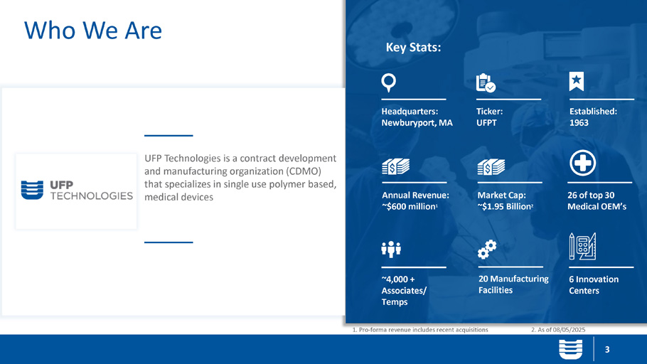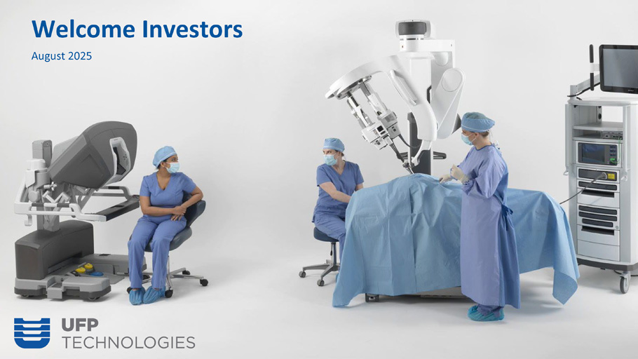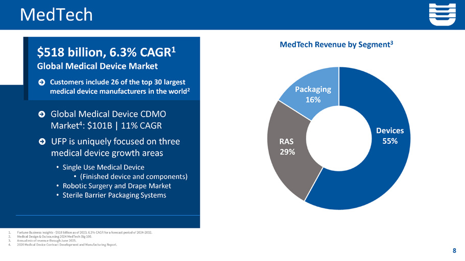 $518 billion, 6.3% CAGR 1 Global Medical Device Market Customers include 26 of the top 30 largest medical device manufacturers in the world 2 1. Fortune Business Insights - $518 billion as of 2023. 6.3% CAGR for a forecast period of 2024 - 2032. 2. Medical Design & Outsourcing 2024 MedTech Big 100. 3. Annual mix of revenue through June 2025. 4. 2020 Medical Device Contract Development and Manufacturing Report. MedTech MedTech Revenue by Segment 3 Global Medical Device CDMO Market 4 : $101B | 11% CAGR • Single Use Medical Device • (Finished device and components) • Robotic Surgery and Drape Market • Sterile Barrier Packaging Systems UFP is uniquely focused on three medical device growth areas 8 Devices 55% RAS 29% Packaging 16%