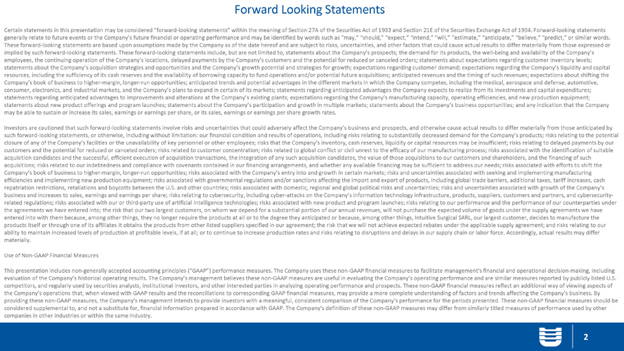 Forward Looking Statements 2 Certain statements in this presentation may be considered “forward - looking statements” within the meaning of Section 27A of the Securities Act of 1933 and Section 21E of the Securities Exchange Act of 1934. Forward - looking statements generally relate to future events or the Company’s future financial or operating performance and may be identified by words s uch as “may,” “should,” “expect,” “intend,” “will,” “estimate,” “anticipate,” “believe,” “predict,” or similar words. These forward - looking statements are based upon assumptions made by the Company as of the date hereof and are subject to risks, uncertainties, and other factors that could cause actual results to differ materially from those expressed or implied by such forward - looking statements. These forward - looking statements include, but are not limited to, statements about t he Company’s prospects; the demand for its products, the well - being and availability of the Company’s employees, the continuing operation of the Company’s locations, delayed payments by the Company’s customers and the potential fo r reduced or canceled orders; statements about expectations regarding customer inventory levels; statements about the Company’s acquisition strategies and opportunities and the Company’s growth potential and strategies for gr owth; expectations regarding customer demand; expectations regarding the Company’s liquidity and capital resources, including the sufficiency of its cash reserves and the availability of borrowing capacity to fund operations and/o r p otential future acquisitions; anticipated revenues and the timing of such revenues; expectations about shifting the Company’s book of business to higher - margin, longer - run opportunities; anticipated trends and potential advantages in the differ ent markets in which the Company competes, including the medical, aerospace and defense, automotive, consumer, electronics, and industrial markets, and the Company’s plans to expand in certain of its markets; statements regard ing anticipated advantages the Company expects to realize from its investments and capital expenditures; statements regarding anticipated advantages to improvements and alterations at the Company’s existing plants; expectations re gar ding the Company’s manufacturing capacity, operating efficiencies, and new production equipment; statements about new product offerings and program launches; statements about the Company’s participation and growth in multi ple markets; statements about the Company’s business opportunities; and any indication that the Company may be able to sustain or increase its sales, earnings or earnings per share, or its sales, earnings or earnings per share gr owt h rates. Investors are cautioned that such forward - looking statements involve risks and uncertainties that could adversely affect the Com pany’s business and prospects, and otherwise cause actual results to differ materially from those anticipated by such forward - looking statements, or otherwise, including without limitation: our financial condition and results of operations, including risks relating to substantially decreased demand for the Company’s products; risks relating to the potential closure of any of the Company’s facilities or the unavailability of key personnel or other employees; risks that the Company’ s i nventory, cash reserves, liquidity or capital resources may be insufficient; risks relating to delayed payments by our customers and the potential for reduced or canceled orders; risks related to customer concentration; risks related to global con flict or civil unrest to the efficacy of our manufacturing process; risks associated with the identification of suitable acquisition candidates and the successful, efficient execution of acquisition transactions, the integration of any such acqui sit ion candidates, the value of those acquisitions to our customers and shareholders, and the financing of such acquisitions; risks related to our indebtedness and compliance with covenants contained in our financing arrangements, and wh eth er any available financing may be sufficient to address our needs; risks associated with efforts to shift the Company’s book of business to higher - margin, longer - run opportunities; risks associated with the Company’s entry into and growth in certain markets; risks and uncertainties associated with seeking and implementing manufacturing efficiencies and implementing new production equipment; risks associated with governmental regulations and/or sanctions affec tin g the import and export of products, including global trade barriers, additional taxes, tariff increases, cash repatriation restrictions, retaliations and boycotts between the U.S. and other countries; risks associated with domestic, re gio nal and global political risks and uncertainties; risks and uncertainties associated with growth of the Company’s business and increases to sales, earnings and earnings per share; risks relating to cybersecurity, including cyber - attacks on th e Company’s information technology infrastructure, products, suppliers, customers and partners, and cybersecurity - related regulations; risks associated with our or third - party use of artificial intelligence technologies; risks associated with new product and program launches; risks relating to our performance and the performance of our counterparties under the agreements we have entered into; the risk that our two largest customers, on whom we depend for a substantial portion of our annual revenues, will not purchase the expected volume of goods under the supply agreements we have entered into with them because, among other things, they no longer require the products at all or to the degree they anticipa ted or because, among other things, Intuitive Surgical SARL, our largest customer, decides to manufacture the products itsel