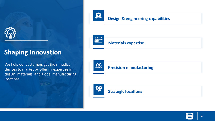 Who We Are UFP Technologies is a contract development and manufacturing organization (CDMO) that specializes in single use polymer based, medical devices 3 Ticker: UFPT Headquarters: Newburyport, MA Annual Revenue: ~$ 600 million 1 ~4,000 + Associates/ Temps Established: 1963 20 Manufacturing Facilities Key Stats: 6 Innovation Centers Market Cap: ~$ 1.95 Billion 2 26 of top 30 Medical OEM’s 1 . Pro - forma revenue includes recent acquisitions 2. As of 08/05/2025