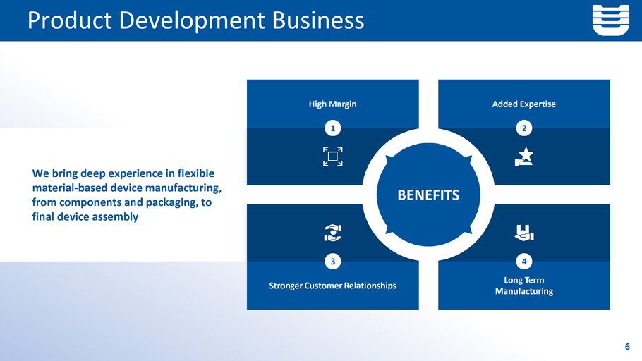 Product Development Business 6 We bring deep experience in flexible material - based device manufacturing, from components and packaging, to final device assembly High Margin Added Expertise Stronger Customer Relationships Long Term Manufacturing 1 2 3 4 BENEFITS