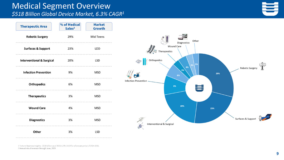 Medical Segment Overview $518 Billion Global Device Market, 6.3% CAGR 1 Therapeutic Area % of Medical Sales 2 1 Fortune Business Insights - $518 billion as of 2023. 6.3% CAGR for a forecast period of 2024 - 2032. 2 Annual mix of revenue through June, 2025 Market Growth Mid Teens 29% Robotic Surgery LDD 23% Surfaces & Support LSD 20% Interventional & Surgical MSD 9% Infection Prevention MSD 6% Orthopedics MSD 3% Therapeutics MSD 4% Wound Care MSD 3% Diagnostics LSD 3% Other 9