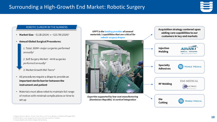 Surrounding a High - Growth End Market: Robotic Surgery 1 Surgical Robotics Market: Growth, Size, Share, and Trends Markets and MarketsTM August 2024 2 NIH 310 Million major surgeries performed each year: Geoffrey P Dobson 3 Towards Healthcare: Robotic Surgery Market Sizing • Market Size : ~$11B (2024) → ~$ 23.7 B (2029) 1 • Annual Global Surgical Procedures : ̶ 1. Total: 300M+ major surgeries performed annually 2 ̶ 2. Soft Surgery Market: ~ 44 M surgeries performed annually 2 ̶ 3. Market Growth Mid - Teens 3 • All procedures require a drape to provide an important sterile barrier between the instrument and patient • Materials must allow robot to maintain full range of motion with minimal complications or time to set up Acquisition strategy centered upon adding core capabilities to our customers in key end markets UFPT is the leading provider of several materials / capabilities that are critical for robotic surgery drapes Expertise supported by low - cost manufacturing (Dominican Republic) & vertical integration Die Cutting Specialty Adhesives RF Welding Injection Molding ROBOTIC SURGERY BY THE NUMBERS 10