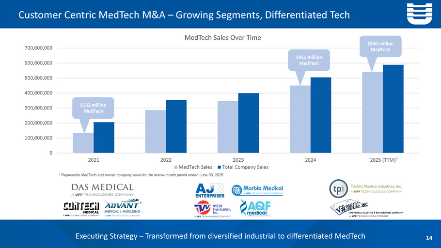13 Acquisition Growth Opportunity Continue to Focus on Higher - Growth, Higher - Margin MedTech Opportunities that Create Value » Become more valuable to our customers » Strategic focus – new capability, geography, growing market segment, materials » Add scale » Look for synergistic opportunities » Cultural fit Goal is for acquisitions to be accretive within the first year. Experienced and disciplined management team with 22 acquisitions completed