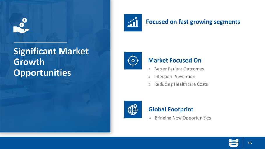 16 Significant Market Growth Opportunities Market Focused On » Better Patient Outcomes » Infection Prevention » Reducing Healthcare Costs Global Footprint » Bringing New Opportunities Focused on fast growing segments