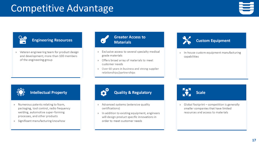Competitive Advantage » Advanced systems (extensive quality certifications) » In addition to existing equipment, engineers will design product specific innovations in order to meet customer needs Quality & Regulatory » In - house custom equipment manufacturing capabilities Custom Equipment » Numerous patents relating to foam, packaging, tool control, radio frequency welding, automotive super - forming processes, and other products » Significant manufacturing knowhow Intellectual Property » Global footprint – competition is generally smaller companies that have limited resources and access to materials Scale » Veteran engineering team for product design and development; more than 100 members of the engineering group Engineering Resources » Exclusive access to several specialty medical grade materials » Offers broad array of materials to meet customer needs » Over 60 years in business and strong supplier relationships/partnerships Greater Access to Materials 17